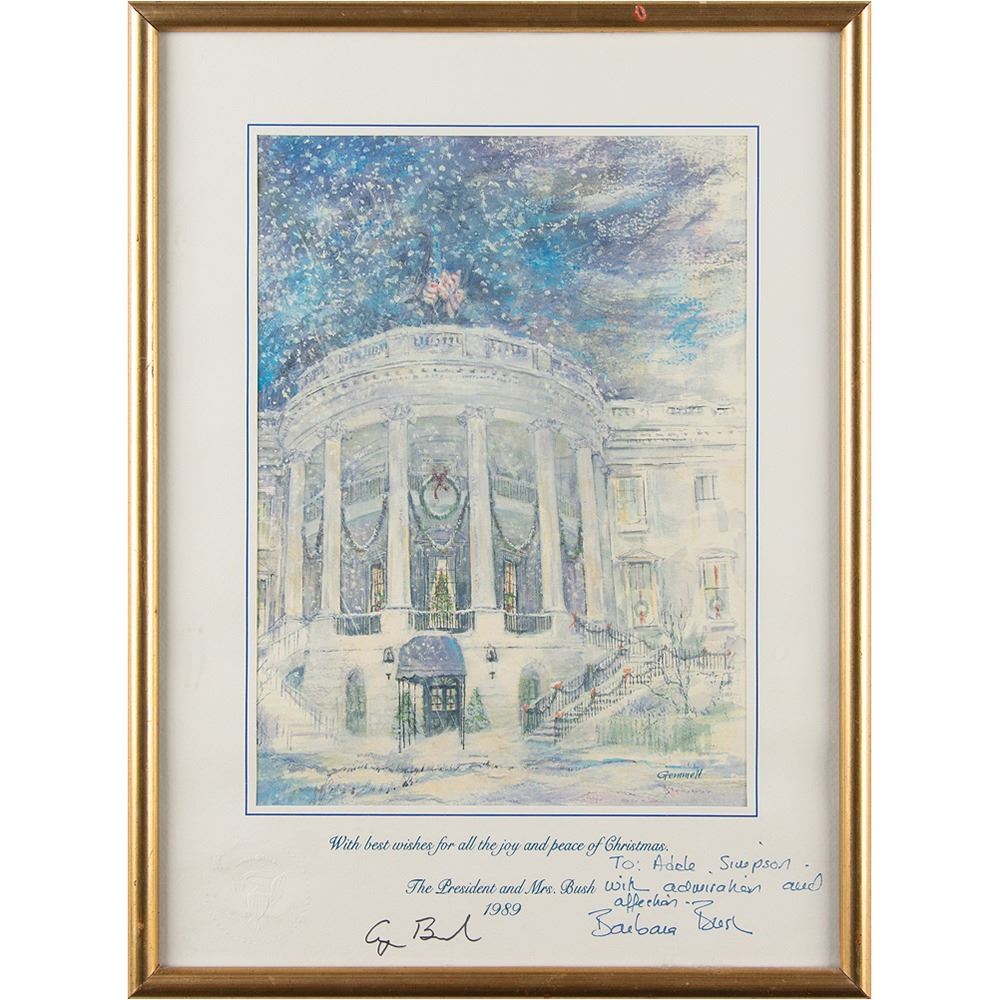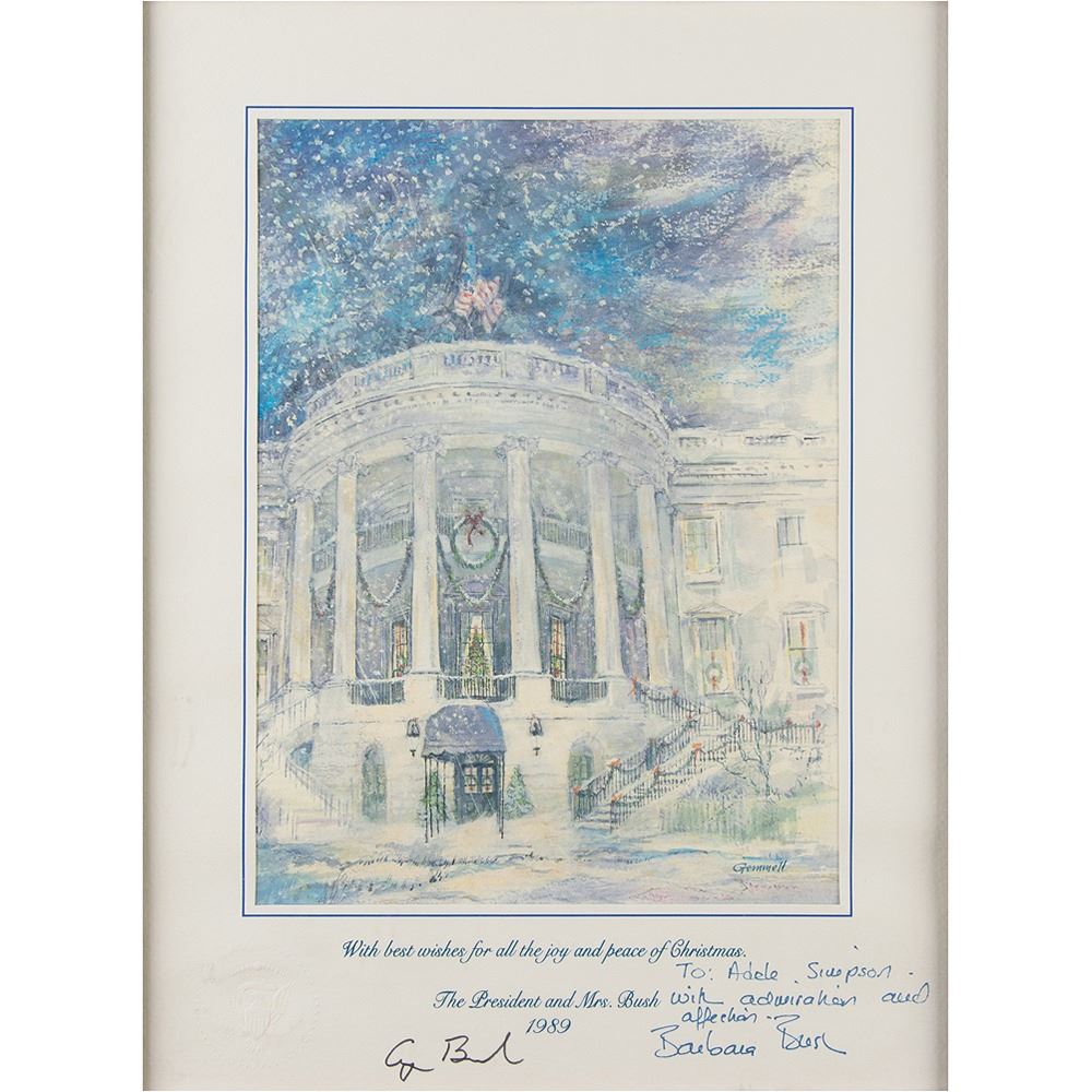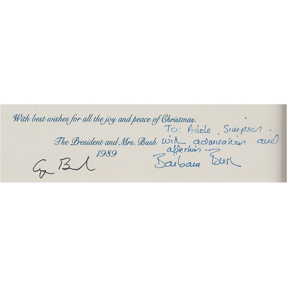 Desirable oversized White House Christmas card from 1989, 11.5 x 15.5, signed and inscribed in the lower border in blue and black felt tip, "To Adele Simpson, with admiration and affection, Barbara Bush," and "George Bush." Framed to an overall size of 12.5 x 16.75. In fine condition. Adele Simpson (1903–1995) was a noted American fashion designer who created outfits for First Ladies Lady Bird Johnson, Pat Nixon, and Barbara Bush.
