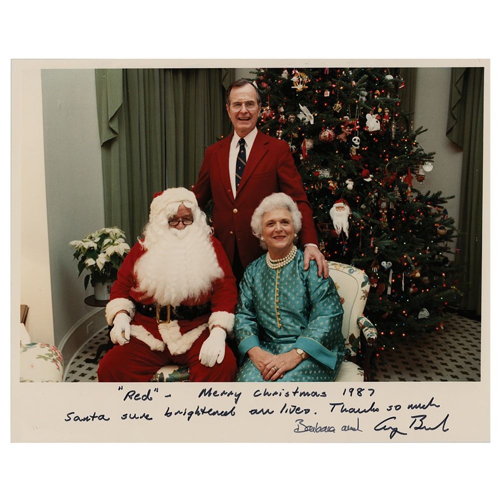 An official color satin-finish 10 x 8 White House photograph of Vice President George Bush posing with his wife Barbara and Santa Claus, signed and inscribed in black felt tip in the lower border, “‘Red’—Merry Christmas 1987, Santa sure brightened our lives. Thanks so much, George Bush†and “Barbara.†In very good to fine condition, with thin paper along the top edge. The recipient, Red Sullivan, was a friend of the Bushes who worked as a plumber at Fort McNair and—as pictured here—would dress up as Santa Claus during the Christmas season.