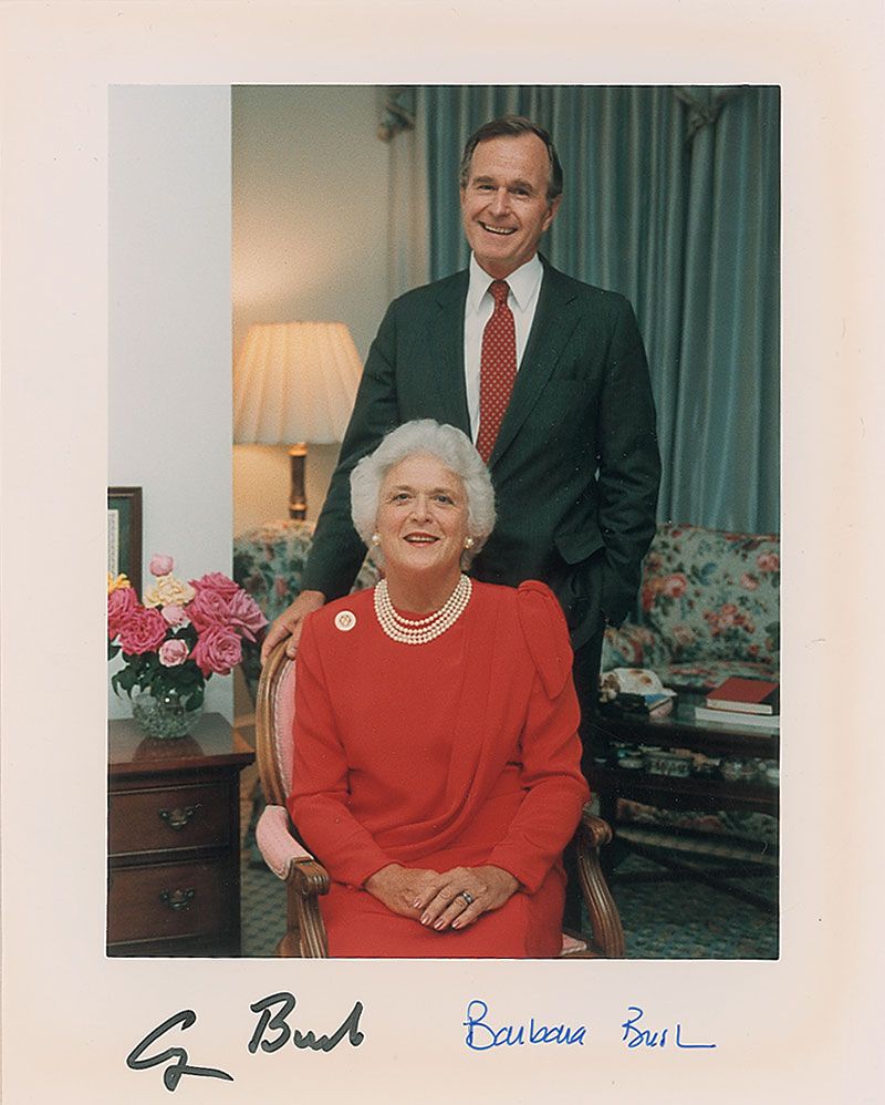 Color satin-finish 8 x 10 photo of the president and first lady, signed in the lower border in black felt tip by George Bush and blue felt tip by Barbara Bush. In very fine condition.