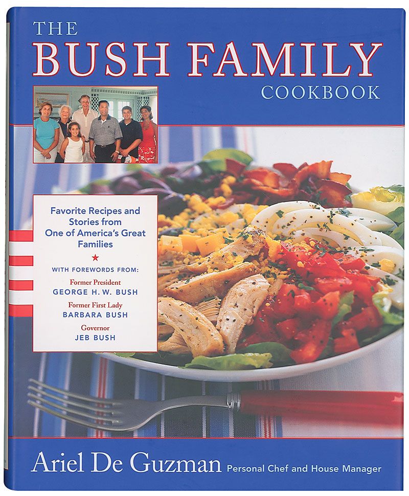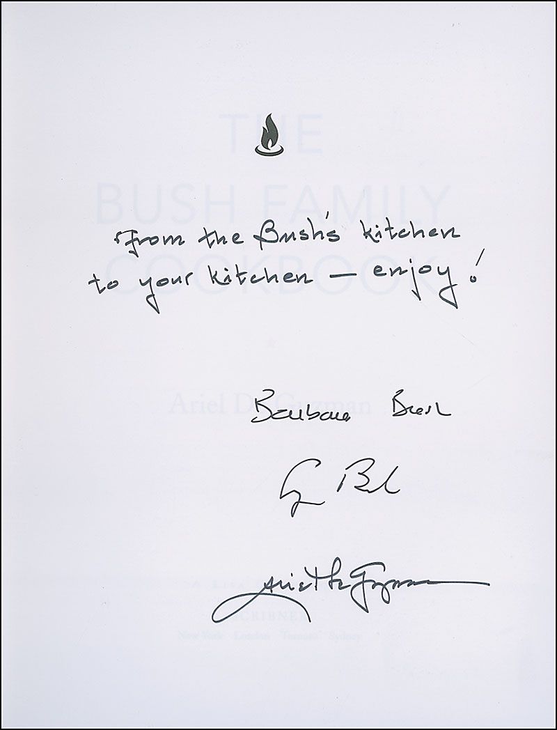 Signed book: The Bush Family Cookbook. First edition, first printing. NY: Scribner, 2005. Hardcover with dust jacket, 7.75 x 9.5, 308 pages. Signed on a free end page by George Bush, Barbara Bush, and their personal chef, Angel Guzman, who has also added, “From the Bush’s kitchen to your kitchen—enjoy!” In very fine condition.