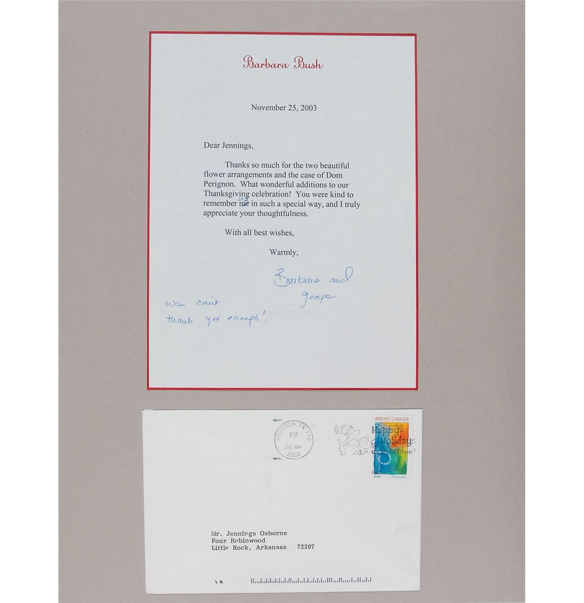 Two letters: one TLS signed “George Bush,” one page, 8.5 x 11, personal letterhead, June 16, 2003. In part: “The attached photo signed this morning by The President and by me…is a first. It is the first and only portrait of Father and Son Presidents who actually posed together, John Quincy Adams after he was elected President never posed with his Dad, John Adams”; and a TLS signed by Barbara Bush, “Barbara and George,” one page, 6.25 x 8.5, personal letterhead, November 25, 2003. In part: “Thanks so much for the two beautiful flower arrangements.” Both letters are securely affixed to opposite sides of an 11.75 x 14.5 scrapbook page. In overall fine condition.