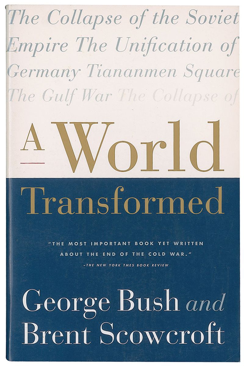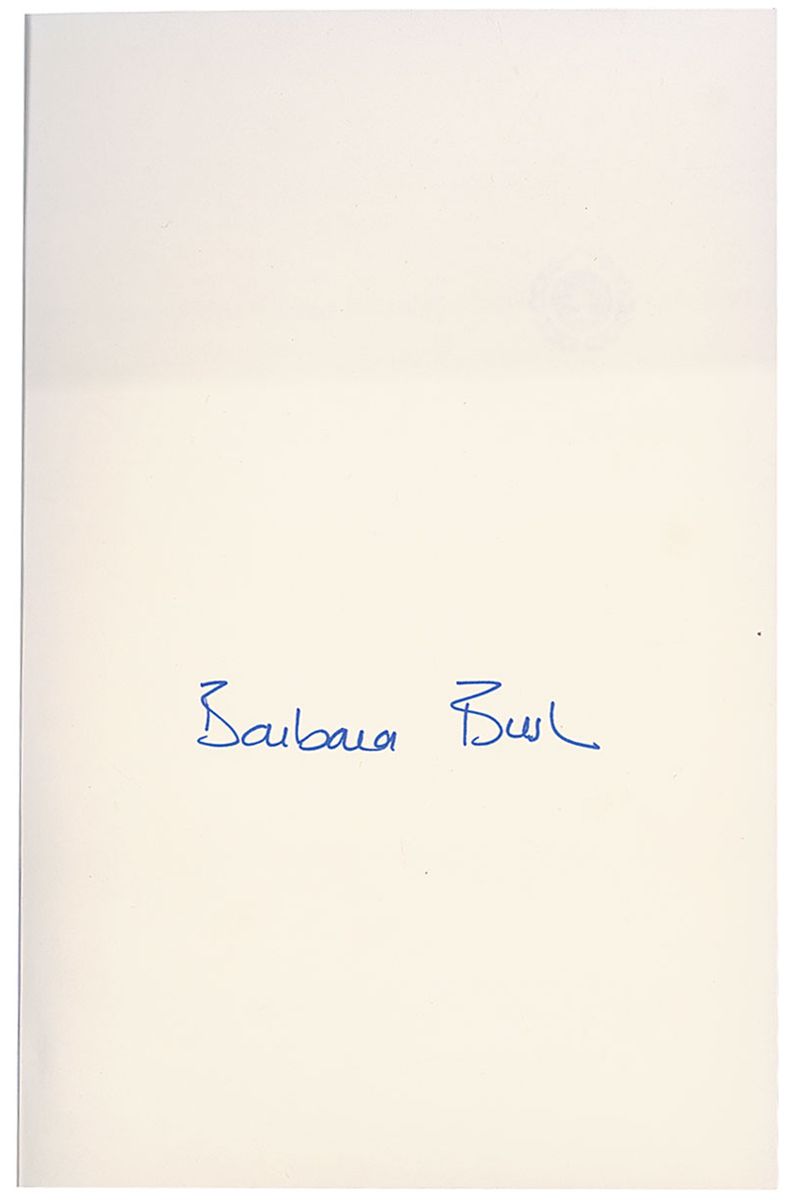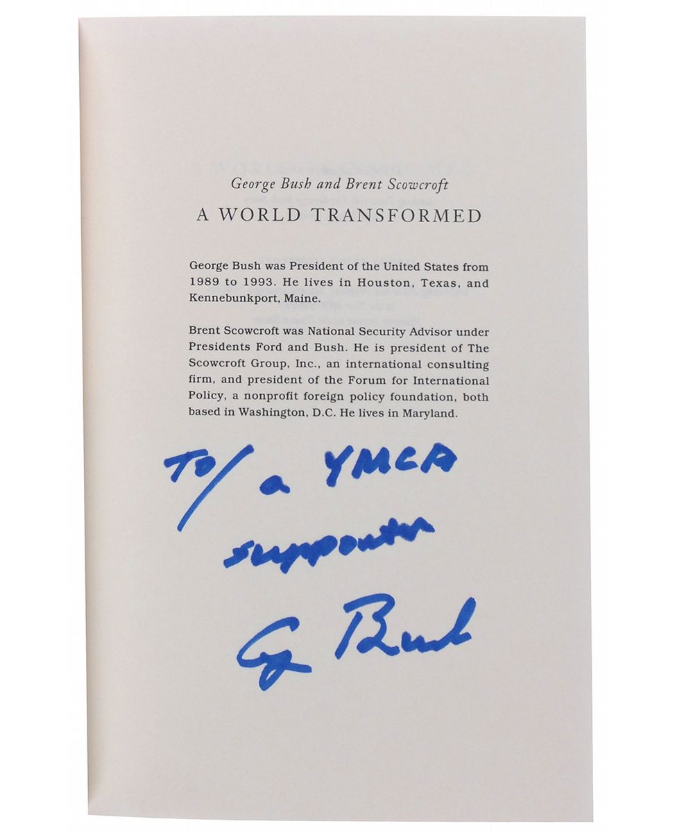 Two books: a softcover edition of A World Transformed signed and inscribed in blue felt tip on an opening page, “To a YMCA supporter, George Bush”; and a hardcover edition of Barbara Bush: A Memoir, signed on the second free end page in blue ink by Barbara Bush. In fine condition.