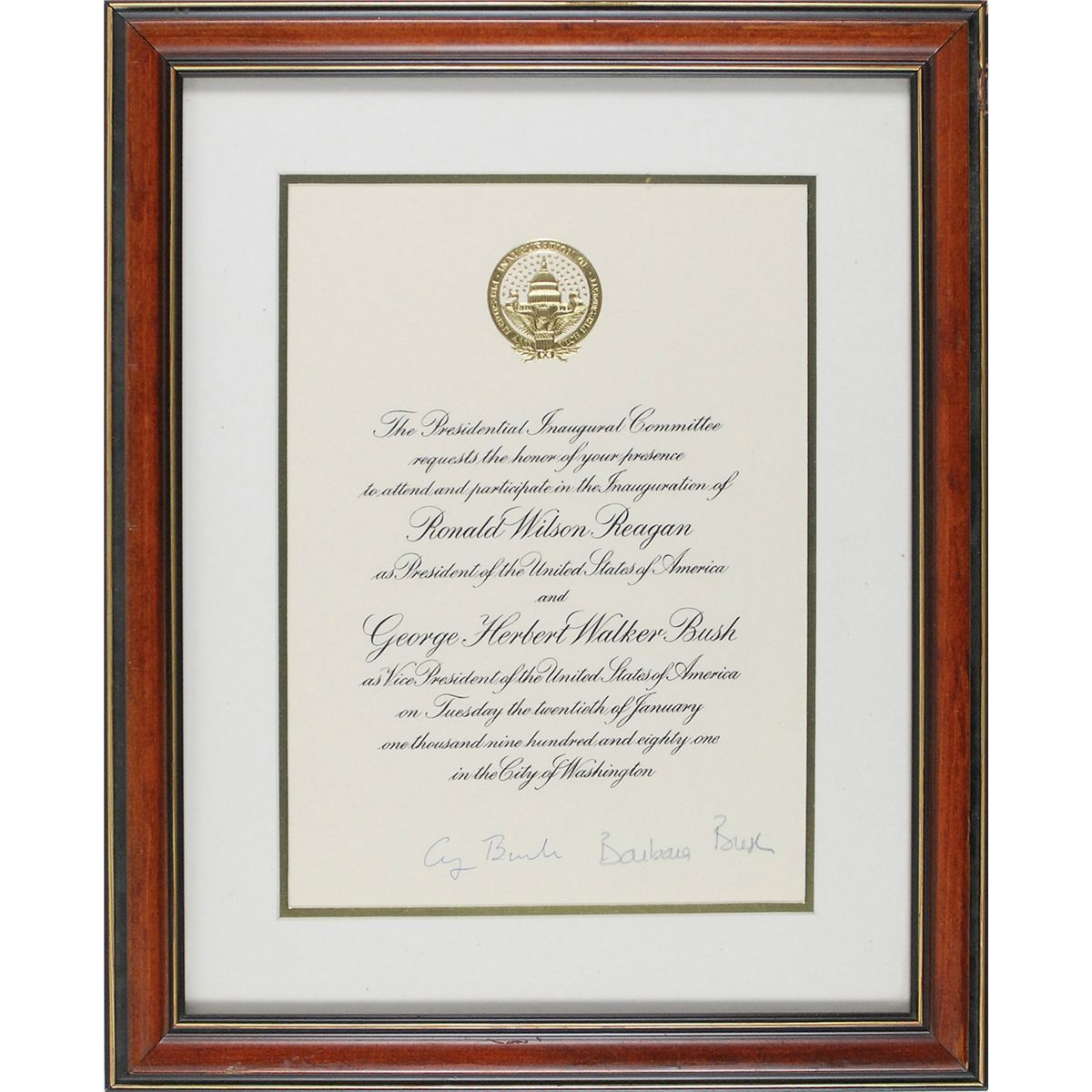 Invitation to the inauguration of Reagan as president and Bush as vice president, January 20, 1981, 7.5 x 10.5, signed at the bottom in blue ballpoint,”George Bush” and felt tip, “Barbara Bush.” Nicely double-matted and framed to an overall size of 13 x 16. In fine condition, with Barbara’s signature slightly faded.