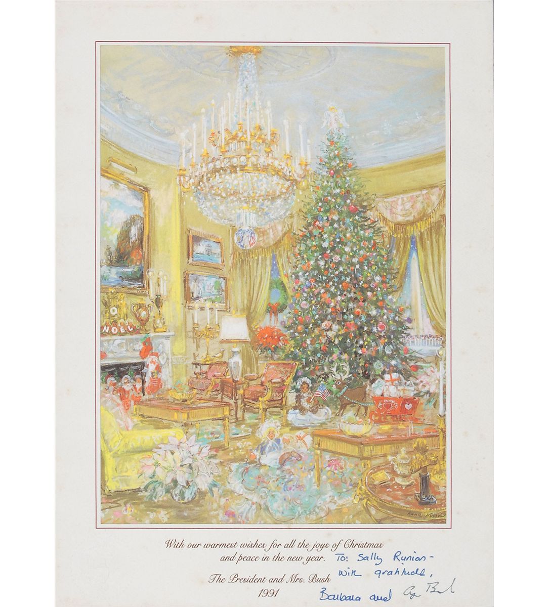 Official oversized 1991 White House Christmas Hallmark print from the Bushes, 11.75 x 16, featuring an image of the upstairs of the White House by Kamil Kubik, officially titled ‘The Family Tree, Upstairs at the White House,’ and signed and inscribed in blue felt tip to Barbara’s personal assistant, “To: Sally Runion—with gratitude, Barbara and,” and in black felt tip, “George Bush.” Print comes in its original presentation folder. Some scattered light toning and foxing to borders, otherwise fine condition.