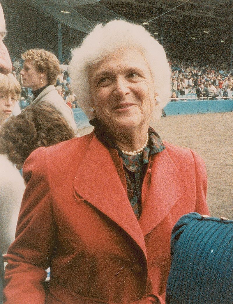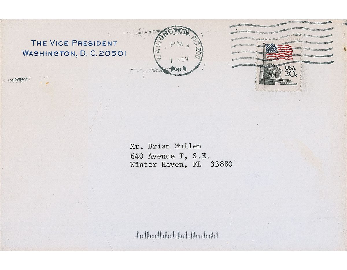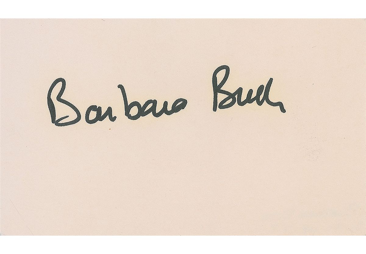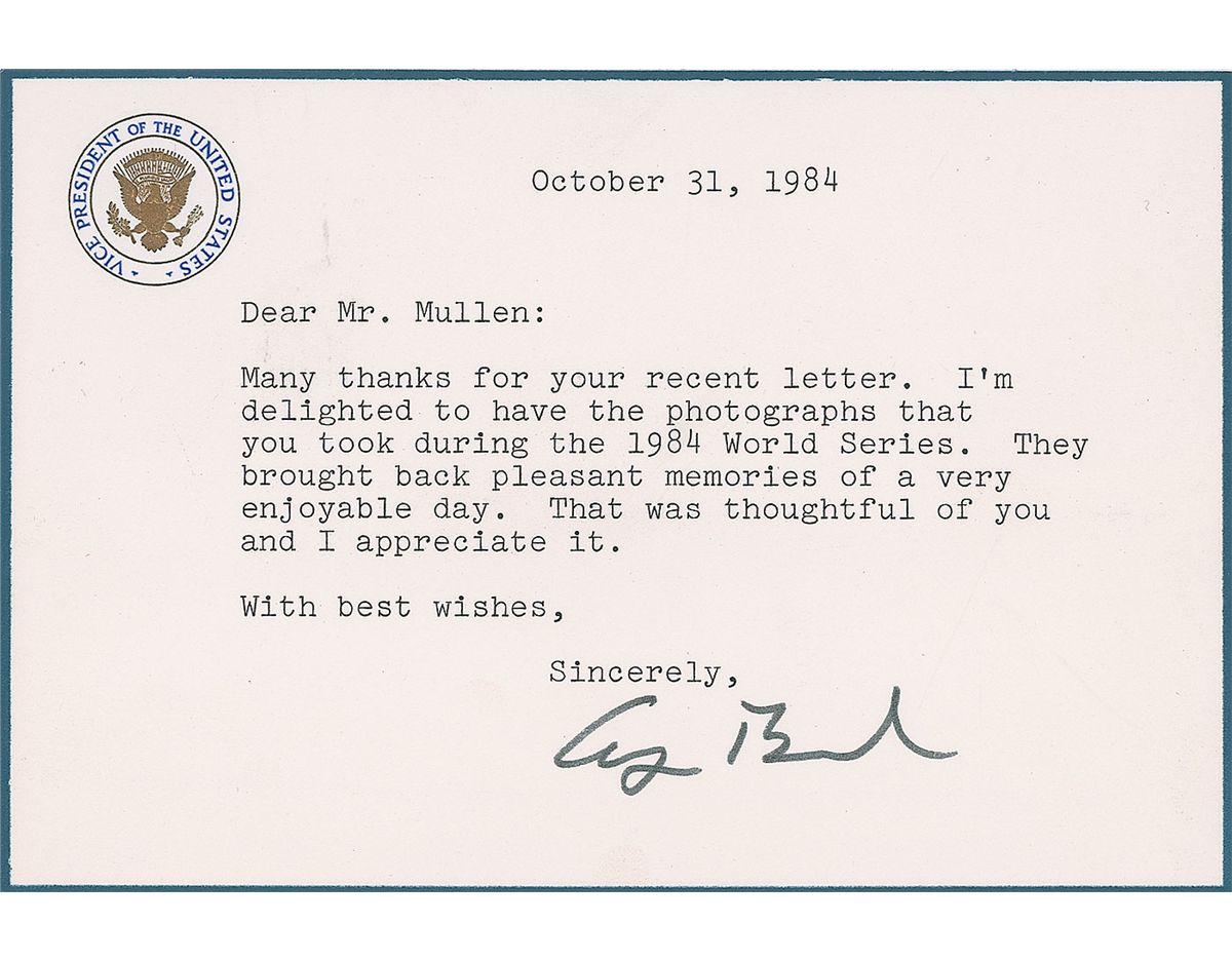 TLS as vice president, signed “George Bush,” on an embossed 6.25 x 4.25 vice presidential card, October 31, 1984, in full: “I’m delighted to have the photographs that you took during the 1984 World Series. They brought back pleasant memories of a very enjoyable day,” and a felt tip signature, “Barbara Bush,” on an off-white 5 x 3 card. In overall fine condition. Accompanied by two of the photos taken at the World Series and the original mailing envelope. Bush—a lifelong baseball lover—threw out the ceremonial first pitch to start the series, which saw the Detroit Tigers triumph over the San Diego Padres in five games.