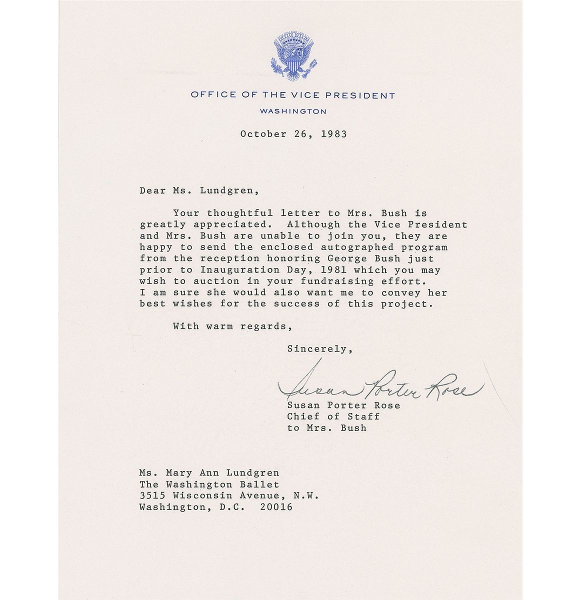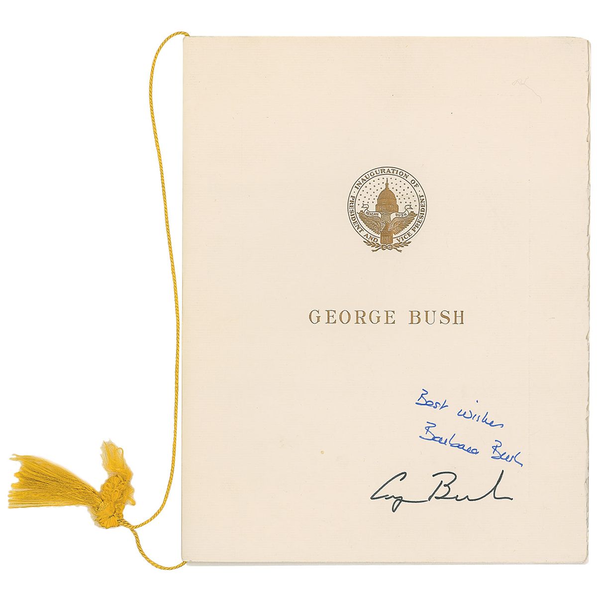 Program for Bush’s inaugural reception upon becoming vice president, held at the Smithsonian National Museum of American History on January 19, 1981, 8.5 x 11, signed on the front cover in black and blue felt tip, “George Bush” and “Best wishes, Barbara Bush.” In fine condition. Accompanied by a transmittal letter from the first lady’s office.