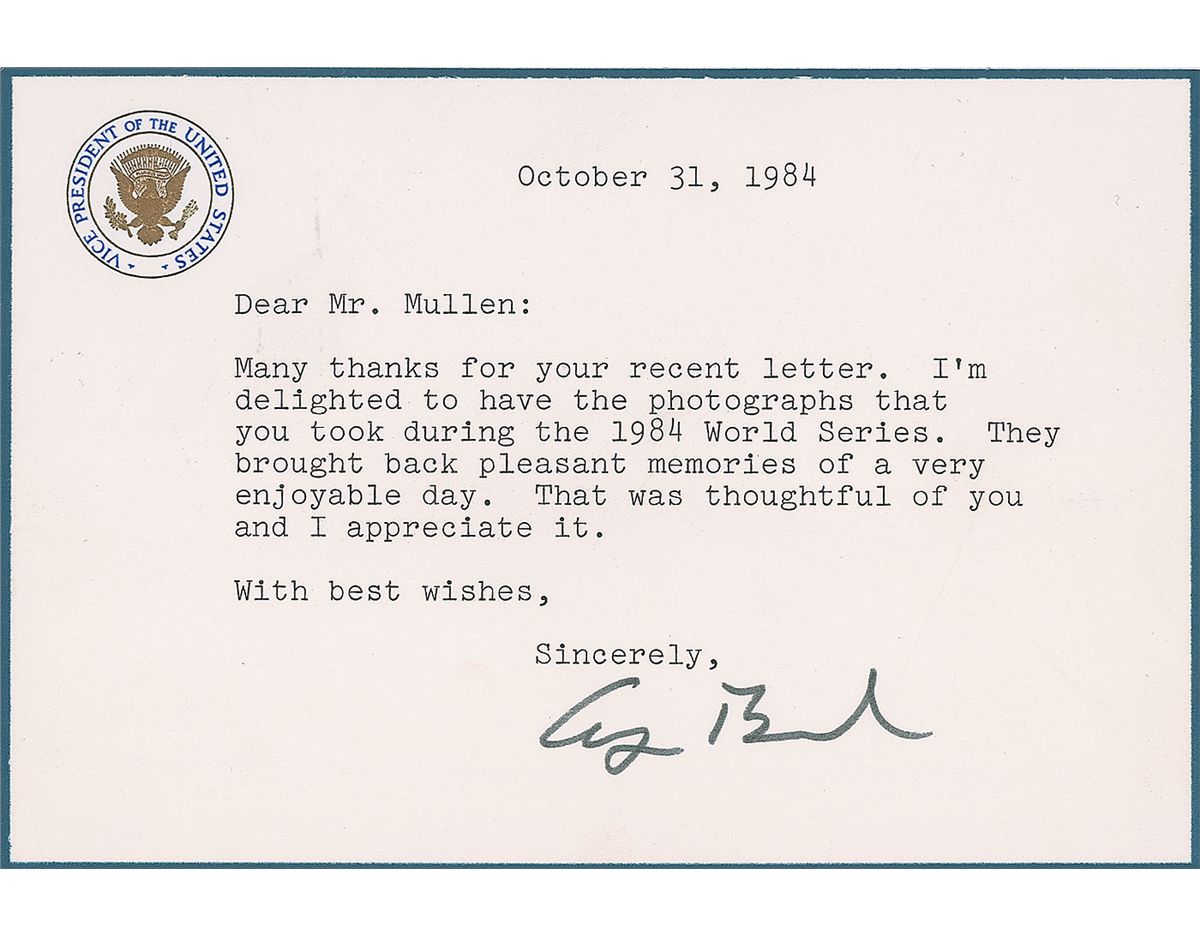 TLS as vice president, signed “George Bush,” on an embossed 6.25 x 4.25 vice presidential card, October 31, 1984, in full: “I’m delighted to have the photographs that you took during the 1984 World Series. They brought back pleasant memories of a very enjoyable day,” and a felt tip signature, “Barbara Bush,” on an off-white 5 x 3 card. In overall fine condition. Accompanied by two of the photos taken at the World Series and the original mailing envelope. Bush—a lifelong baseball lover—threw out the ceremonial first pitch to start the series, which saw the Detroit Tigers triumph over the San Diego Padres in five games.