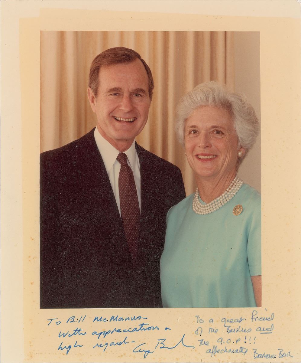 Color satin-finish 8.25 x 9.75 photo of George and Barbara Bush, signed and inscribed in the lower border in blue felt tip, “To Bill McManus—with appreciation & high regard—George Bush” and “To a great friend of the Bushes and the G. O. P!!! Affectionately, Barbara Bush.” In very good to fine condition, with light toning and scattered foxing to the border.