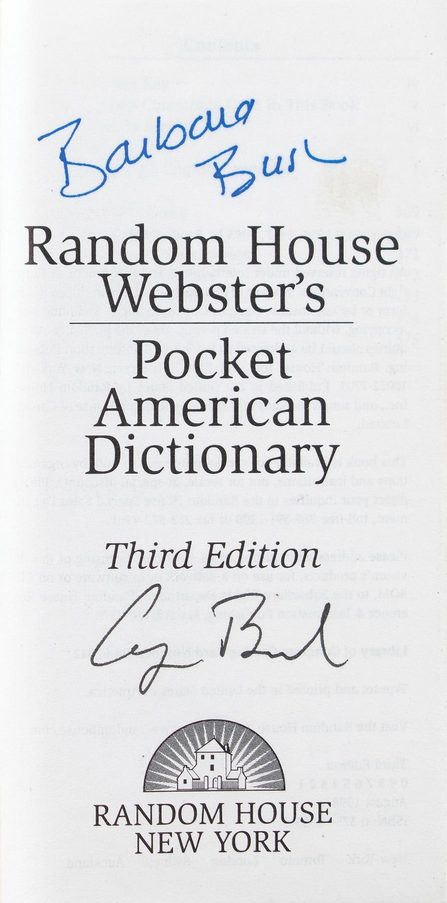 Signed book: Random House Webster's Pocket American Dictionary. First edition. NY: Random House, 1998. Softcover with blue plastic George Bush Presidential Library and Museum dust jacket, 2.75 x 5.25, 376 pages. Signed on the title page in black ink by George Bush, and in blue ink by Barbara Bush. In fine condition.