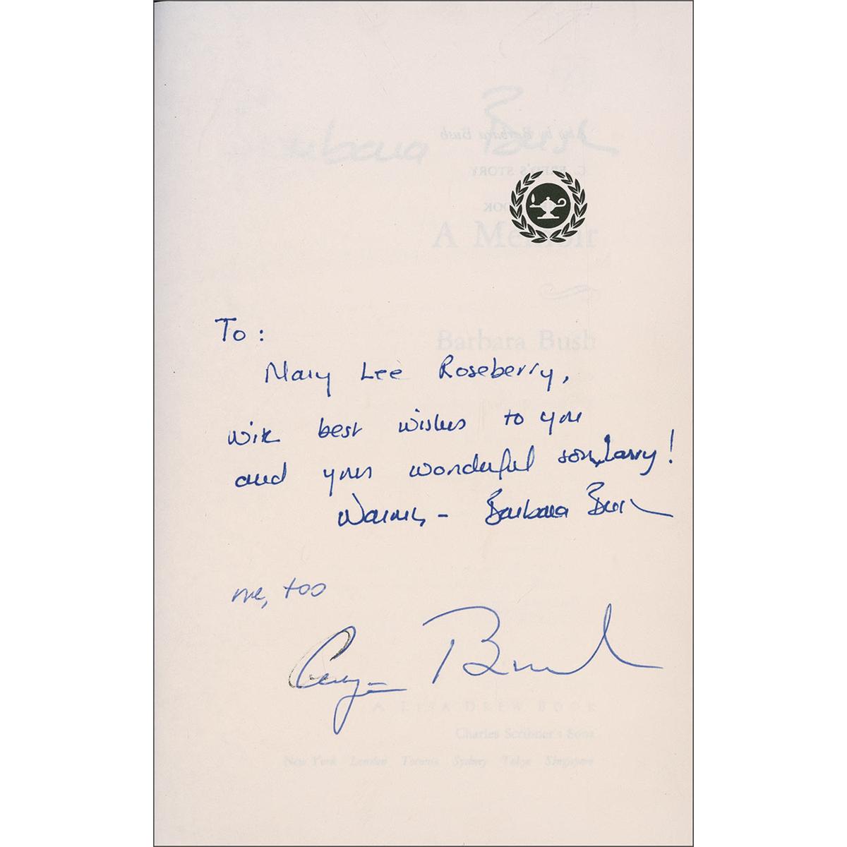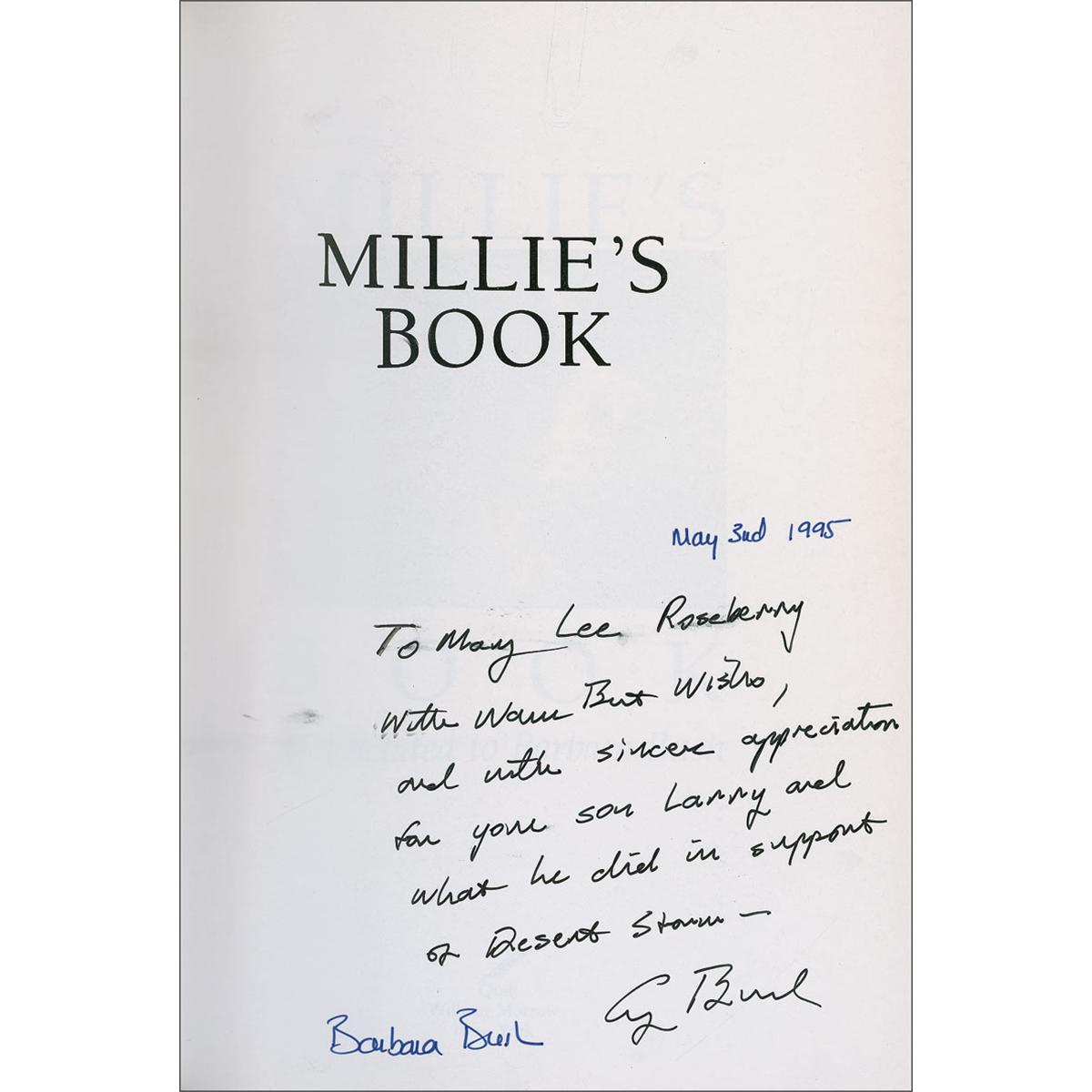 Two signed books: a hardcover copy of Barbara Bush; A Memoir, signed and inscribed on the first free end page, “To: Mary Lee Roseberry, with best wishes to you and your wonderful son Larry! Warmly, Barbara Bush,” and “me, too George Bush”; and a softcover edition of Millie’s Book, signed and inscribed on the half-title page, “To Mary Lee Roseberry, with warm best wishes, and with sincere appreciation for your son Larry and what he did in support of Desert Storm—George Bush,” and “Barbara Bush,” adding “May 3rd 1995,” at the top. In fine condition, with a few light brushes to George’s inscription.