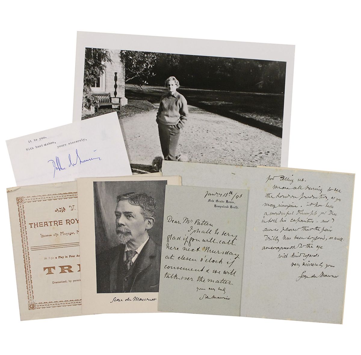 Three items: two ALSs, signed “George du Maurier,” one single page and one multi-page, one dated January 15, 1895, the other dated September 10. The September letter regards a London stage production of his novel Trilby, mentioning the dramatist Paul Potter and actor Herbert Beerbohm Tree in the role of Svengali. That letter is affixed by its second integral page to a slightly larger sheet; and a one-page TLS from Daphne du Maurier forwarding some letters and mementos. Accompanied by a program from the Theatre Royal in Haymarket for a production of Trilby; an engraved portrait of du Maurier, bearing a printed signature; and glossy 10 x 8 publicity photo of Daphne du Maurier outside her home. In fine condition.