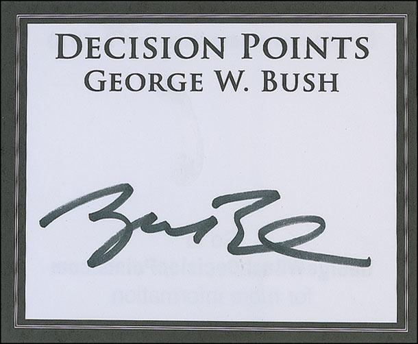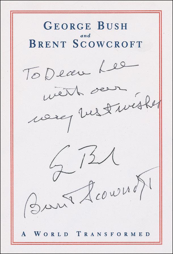Two signed bookplates: a 4.25 x 3.75 bookplate for Decision Points, signed in black felt tip by George W. Bush; and a 3.75 x 5.5 bookplate for A World Transformed, signed in black ballpoint by George Bush, and also signed and inscribed by Brent Scowcroft. In very fine condition.