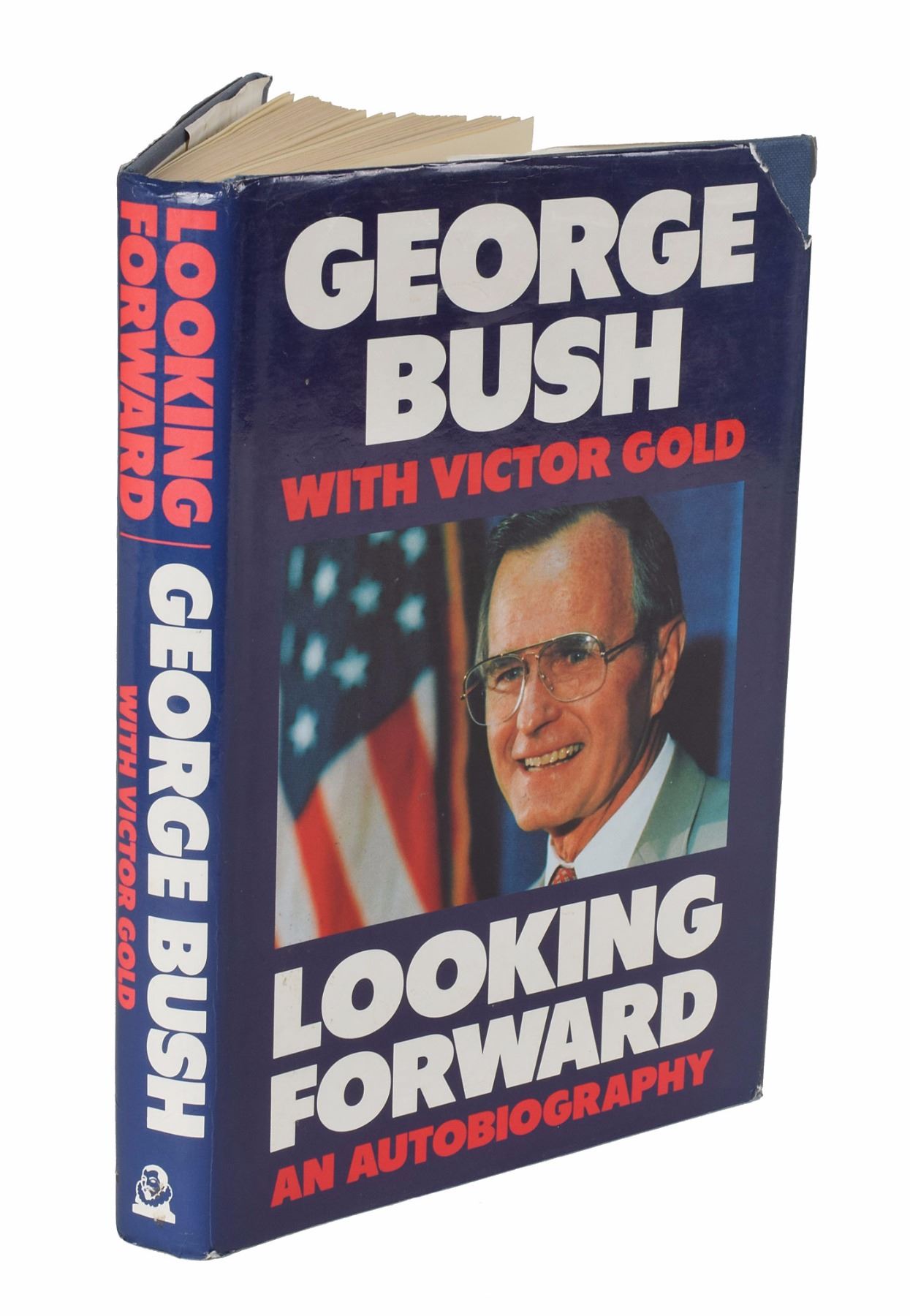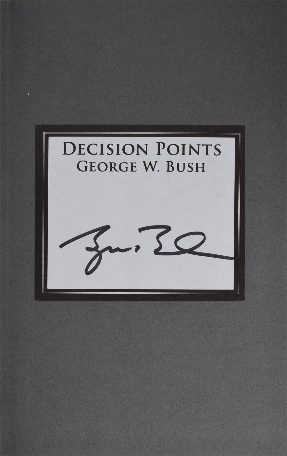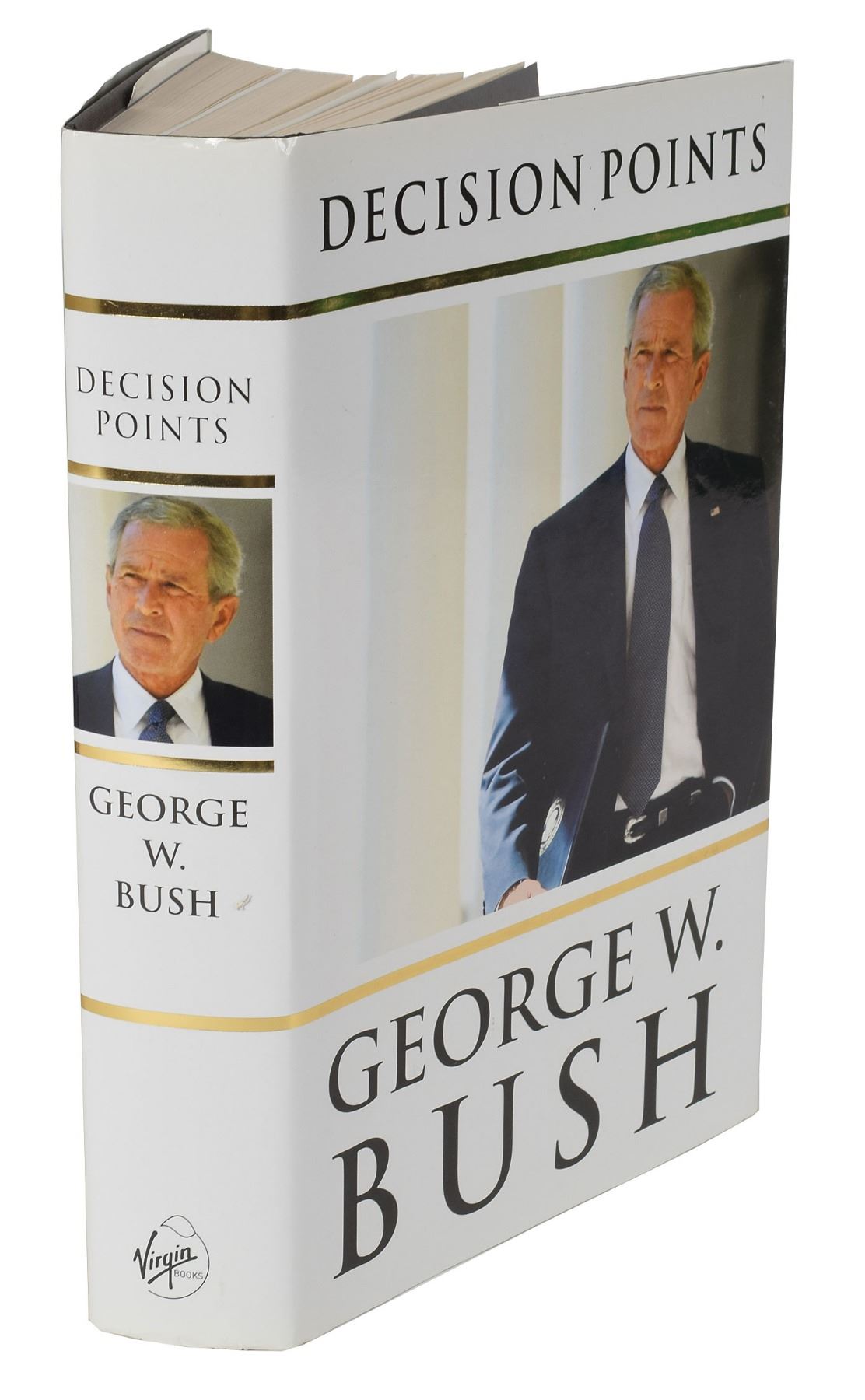Two books: Looking Forward, first UK edition published in London by The Bodley Head in 1988, hardcover with dust jacket, signed on a loosely laid in bookplate in black ballpoint by George Bush; and Decision Points, first UK edition published by Virgin Books in 2010, hardcover with dust jacket, signed on a bookplate affixed to the first free end page in black felt tip by George W. Bush. In overall fine condition, with paper loss to one corner of the Looking Forward dust jacket.