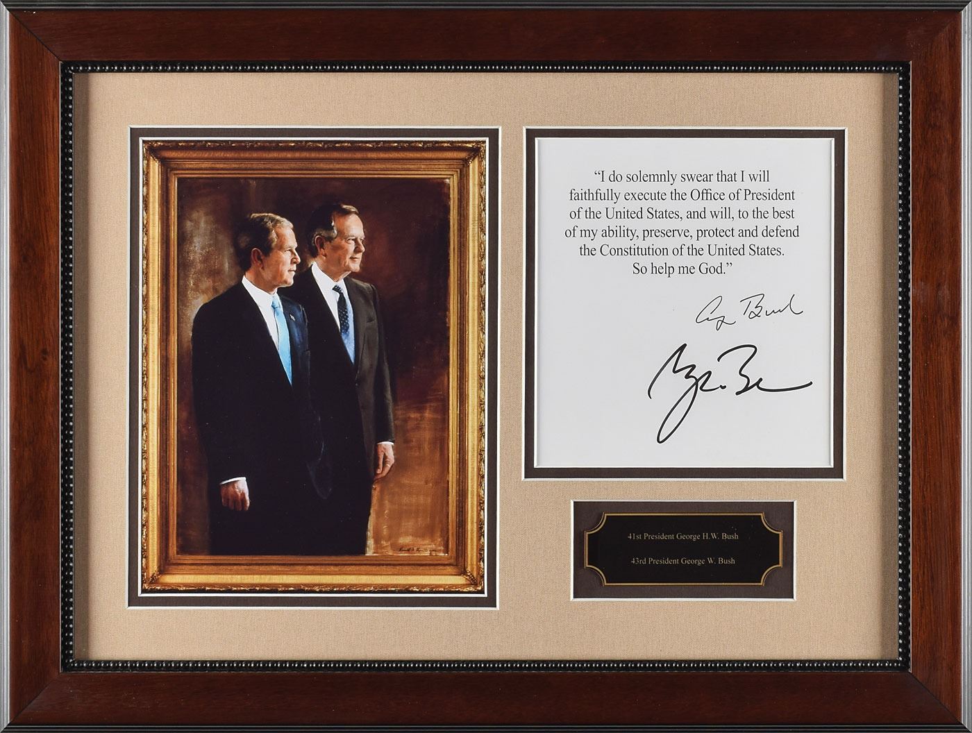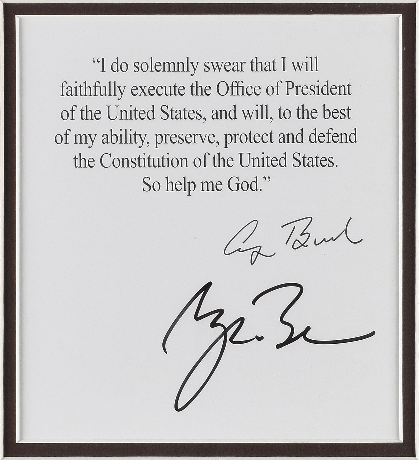 Souvenir typescript of the oath of office, one page, 6 x 6.75, signed at the conclusion in black felt tip by George Bush and George W. Bush. In full: "I do solemnly swear that I will faithfully execute the Office of President of the United States and will, to the best of my ability, preserve, protect and defend the Constitution of the United States. So help me God." Double-matted and framed with a portrait and plaque to an overall size of 19.5 x 15. In fine condition.