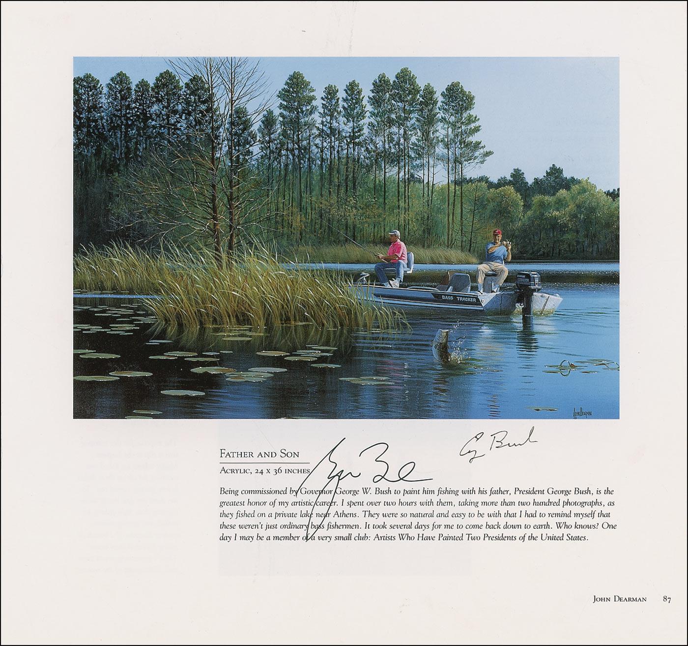 Color 11.5 x 11 book photo of a painted portrait of the two bass fishing entitled Father and Son, signed in black ink by both George and George W. Bush. Some light creasing to bottom border, and paperclip impressions to top edge, otherwise fine condition. Accompanied by a certificate of authenticity from Sharon Bush noting the photo comes from her personal collection. Pre-certified PSA/DNA and RRAuction COA.