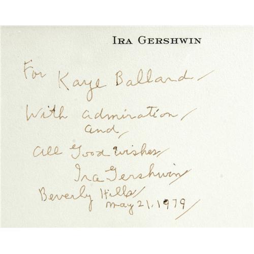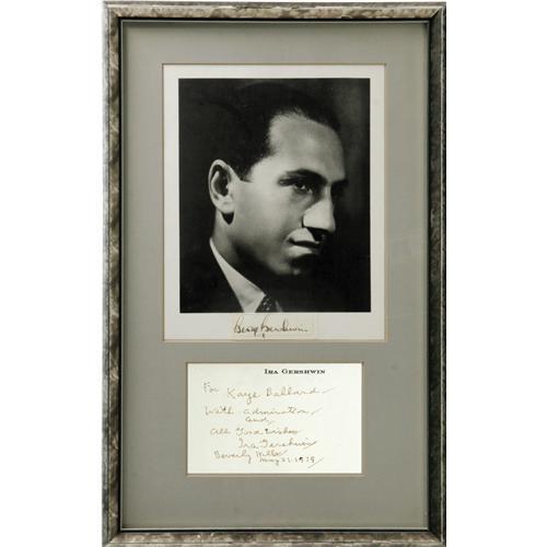 <B>George and Ira Gershwin Framed Signatures.</B></I> Matted tribute (12" x 19") to the brilliant composers features an 8" x 10" photograph of George Gershwin, beneath which is gray paper with letterhead of Ira Gershwin, reading "For Kaye Ballard/With admiration/and/All Good Wishes/Ira Gershwin/Beverly Hills/May 21, 1979." There is some age damage in the gray frame, but the autographs in Excellent condition. <I>From the Kaye Ballard Collection.</B></I> <I>Accompanied by LOA from PSA/DNA.</B></I><I>Accompanied by LOA from PSA/DNA.</B></I><BR><BR><b>Shipping:</b> Framed - without Glass, Medium (<a target="_blank" href="http://www.heritageauctions.com/common/shipping.php">view shipping information</a>)