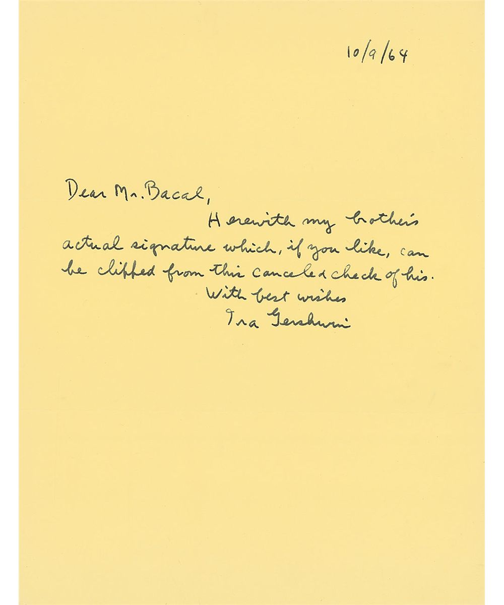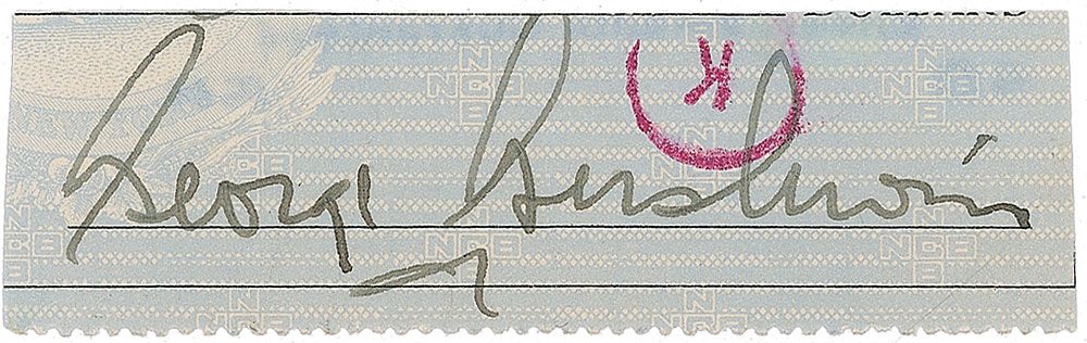 Two items: one fountain pen signature, “George Gershwin,” on a 3 x .75 slip clipped from a check; and an ALS signed “Ira Gershwin,” one page, 8.5 x 11, October 9, 1964. In full: “Herewith my brother’s actual signature which, if you like, can be clipped from this canceled check of his.” In overall fine condition, with a faint central vertical fold to the slip and a bank stamp slightly affecting the signature.
