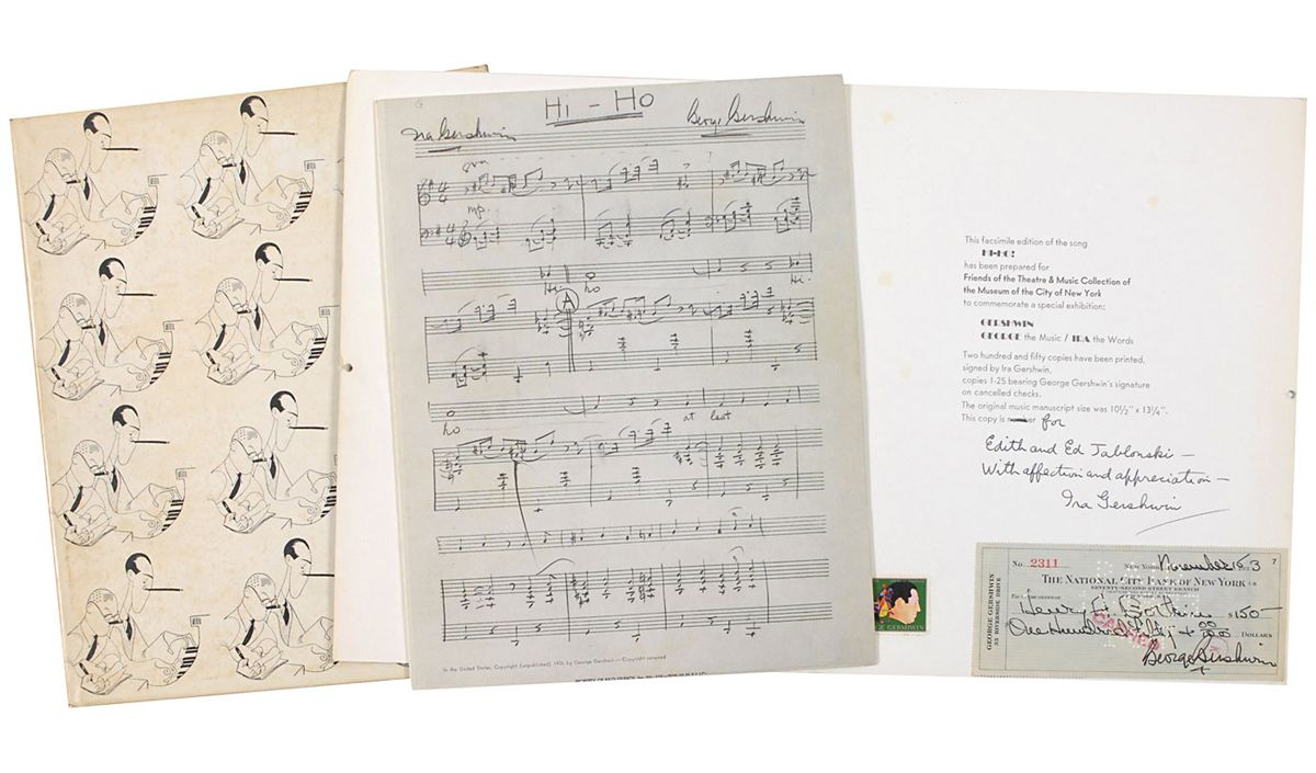 Very rare limited edition facsimile copy of the original manuscript for ‘Hi-Ho!,’ softcover in slipcase, 10 x 12.25, eight pages, with a personal check affixed inside the back cover, 6.25 x 2.75, filled out in another hand and signed by George, “George Gershwin,” payable to Henry A. Botkin for $150, November 15, 1933. Also signed and inscribed inside the back cover in fountain pen by his brother, “For Edith and Ed Jablonski—With affection and appreciation—Ira Gershwin.” An explanatory note printed inside the cover reads, “Two hundred and fifty copies have been printed, signed by Ira Gershwin, copies 1–25 bearing George Gershwin’s signature on cancelled checks.” A few light spots of foxing to the back cover, and overall foxing and soiling to the slipcase, otherwise fine condition. Jablonski was a notable author whose work included biographies of Gerswhin, Harold Arlen, Alan Jay Lerner, and Irving Berlin. Henry Botkin, the recipient of the check, was a renowned painter and the cousin of Gershwin, helping him to assemble a world-class art collection that included works by Picasso, Modigliani, Chagall, and Kokoschka. An extraordinarily rare piece with exquisite associations.