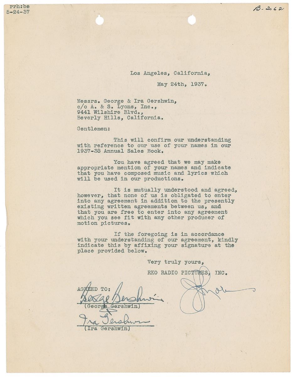 DS, one page, 8.5 x 11, May 24, 1937. Document concerning their agreement with RKO Radio Pictures. In part: “This will confirm our understanding with reference to our use of your names in our 1937–1938 Annual Sales Book. You have agreed that we may make appropriate mention of your names and indicate that you have composed music and lyrics which will be used in our productions.” Handsomely signed at the conclusion by both George and Ira Gershwin, and countersigned by an RKO representative. In fine condition, with expected document wear and a few light creases.