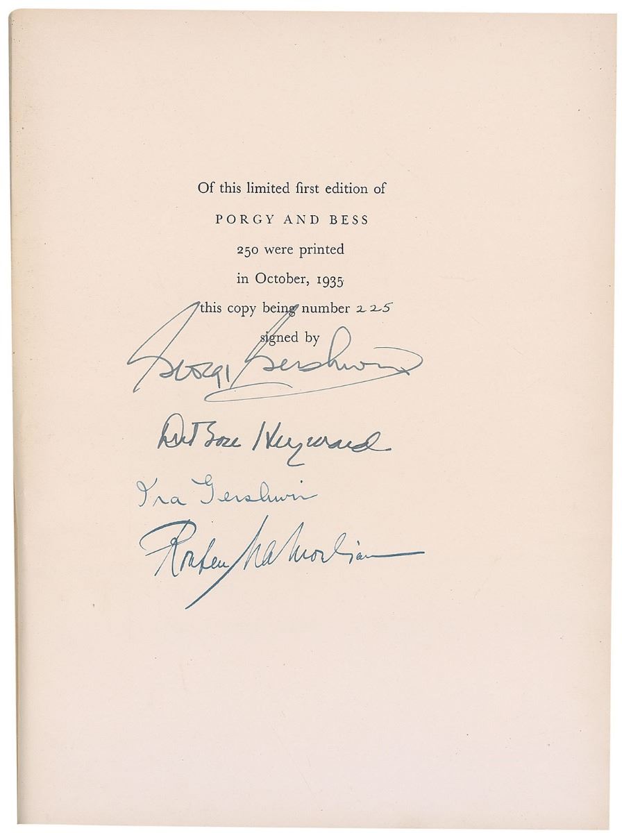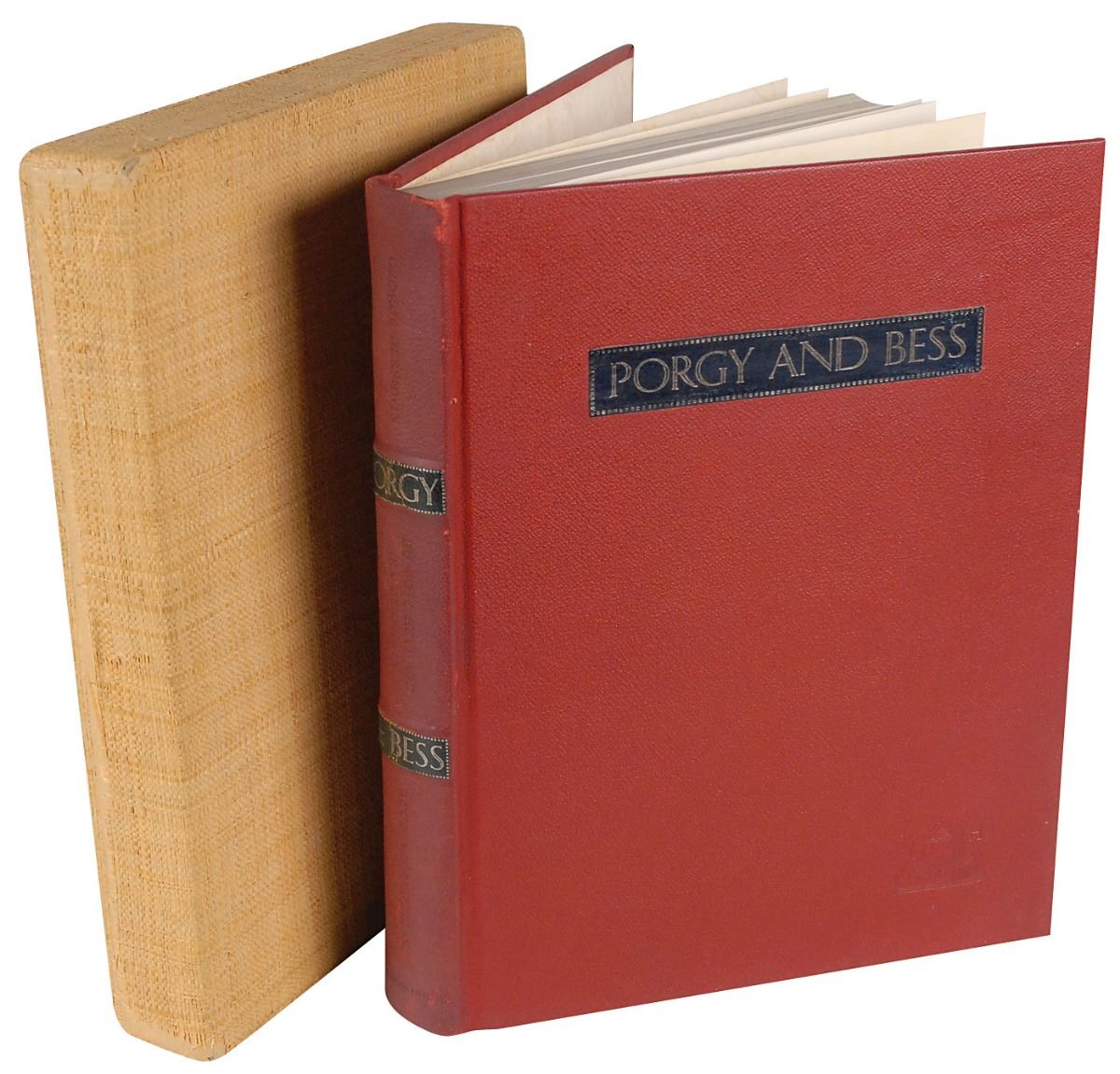 Signed book: Porgy and Bess. Limited first edition of 250 copies (this being No. 225). NY: Random House, 1935. Hardcover with slipcase, 9.75 x 12.5, 559 pages. Signed on the colophon in fountain pen by George Gershwin, Ira Gershwin, librettists Dubose Heyward, and director Rouben Mamoulian. Autographic condition: fine. Book condition: VG/None. Red leather-bound boards with black leather title-pieces, gilted upper textblock edge, and handmade endpapers. Minor rubbing to edges; spine rubbed and slightly sunned; insect damage to spine-edges and front/rear interior hinges; hinge following title page is cracked; mild foxing and discoloration to textblock edges and endpapers; small seller’s sticker to rear pastedown. In protective plastic sleeve and VG- slipcase, with rubbed and fraying edges to the woven, strawlike fabric. Seldom offered, these editions are highly coveted by collectors.