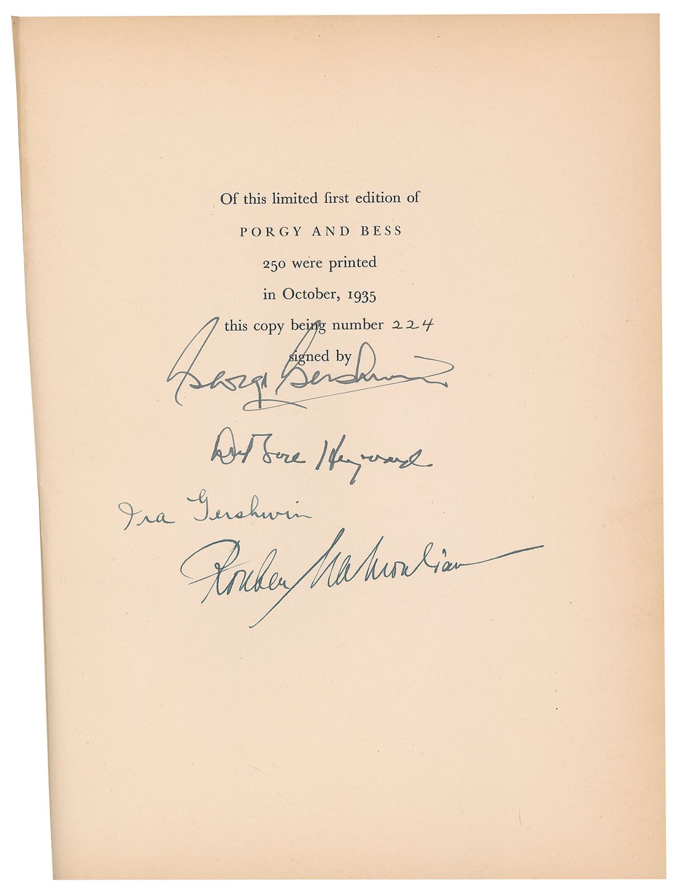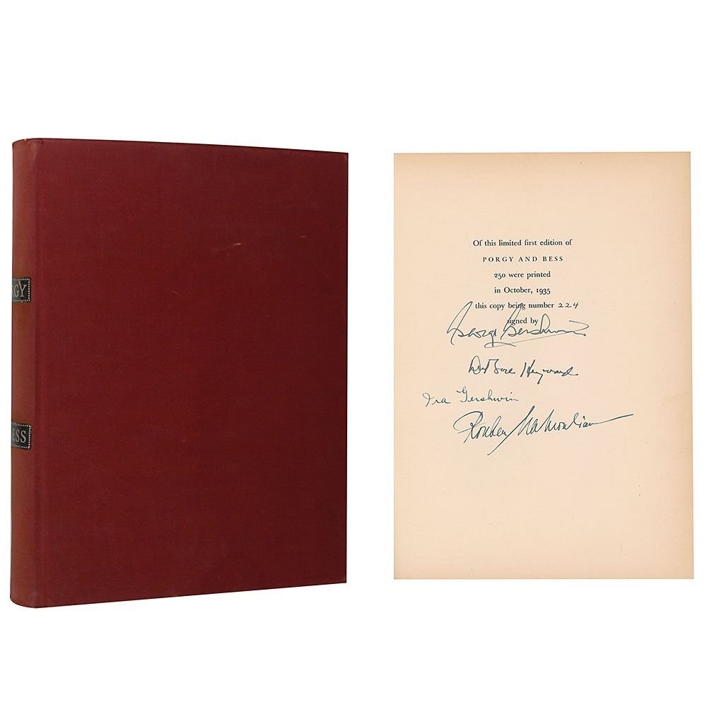 Signed book: Porgy and Bess. Limited first edition of 250 copies (this being No. 224). NY: Random House, 1935. Hardcover, 9.75 x 12.5, 559 pages. Signed on the colophon in fountain pen by George Gershwin, Ira Gershwin, librettist Dubose Heyward, and director Rouben Mamoulian. Autographic condition: fine. Book condition: VG-/VG-. Porgy and Bess, written as an 'American folk opera' according to George Gershwin, made its premiere on Broadway in the fall of 1935, and later toured several eastern cities. Although deemed a commercial failure during its initial run, it is now regarded as one of the most important American operas of the 20th century.