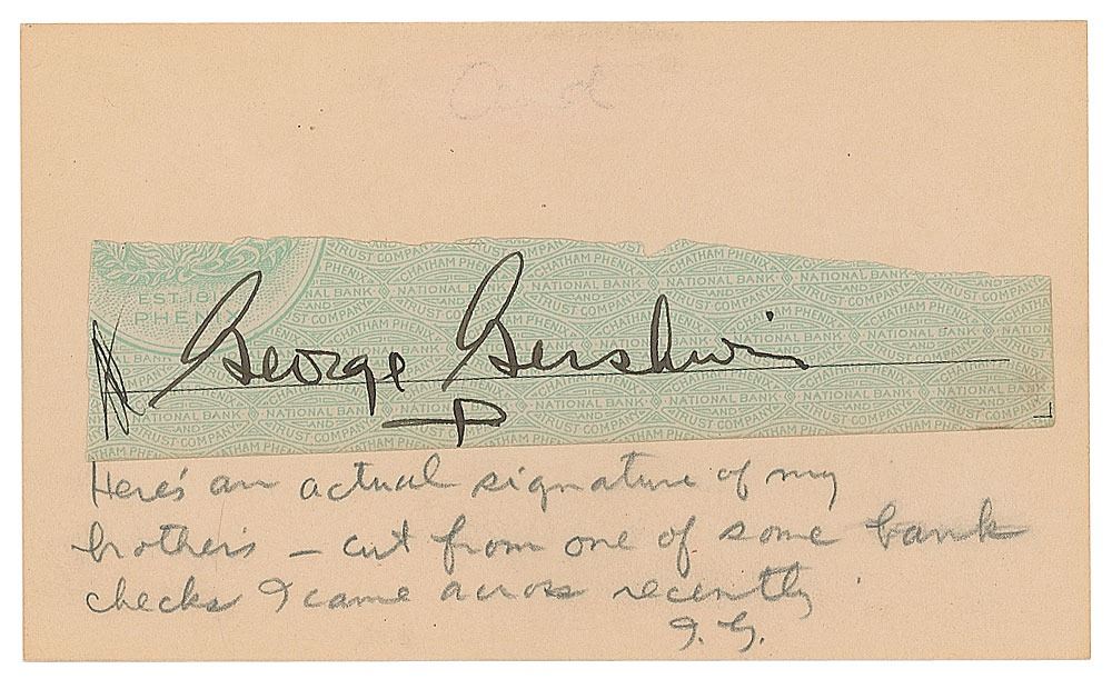 Vintage ink signature, "George Gershwin,” on a light green 4.5 x 1 slip clipped from a check, which is affixed to an off-white 5 x 3 card bearing an ANS in pencil from his brother Ira Gershwin, who signs with his initials, "I. G.," and reads: "Here's an actual signature of my brother's—cut from one of some bank checks I came across recently." In fine condition.