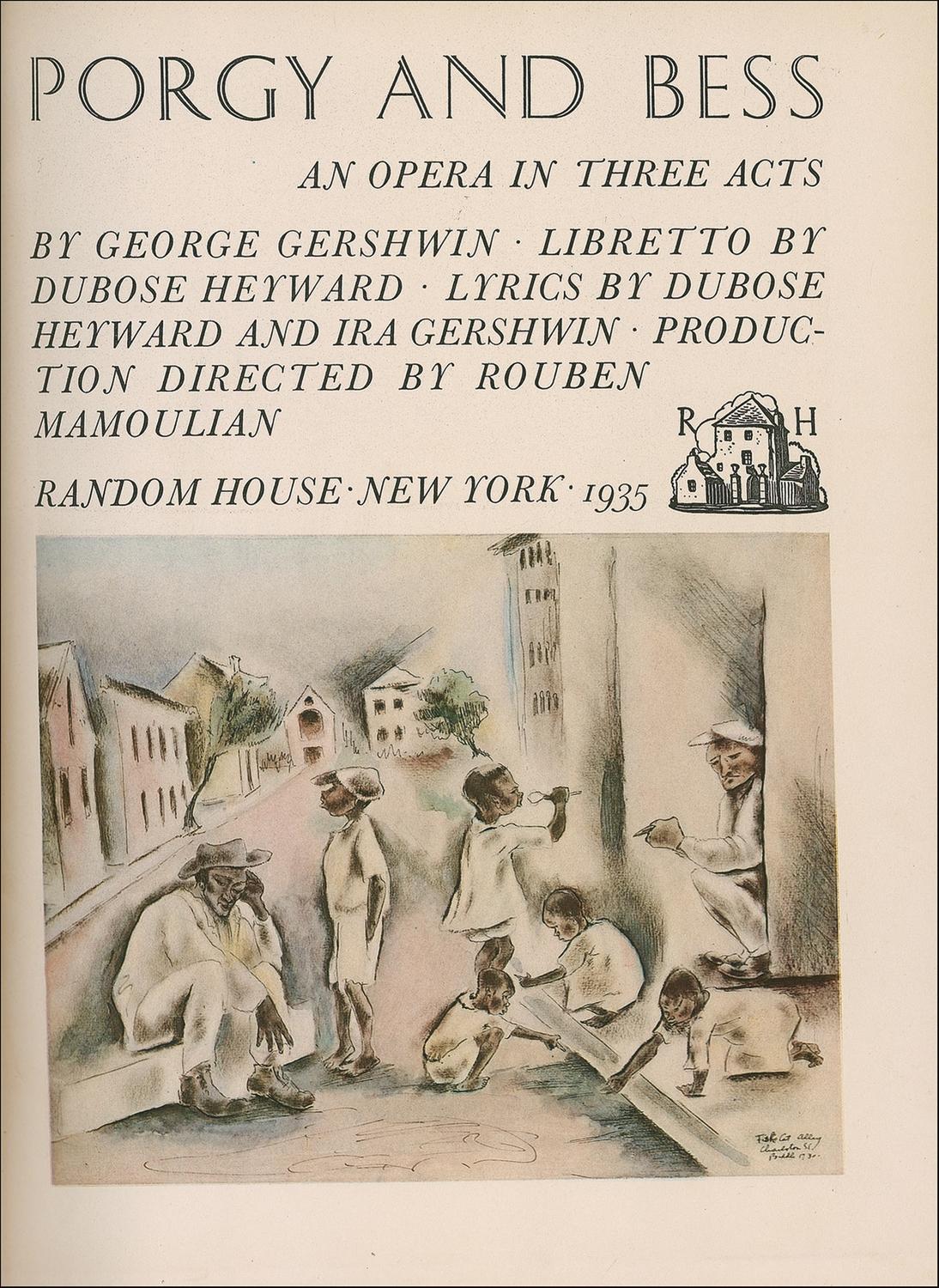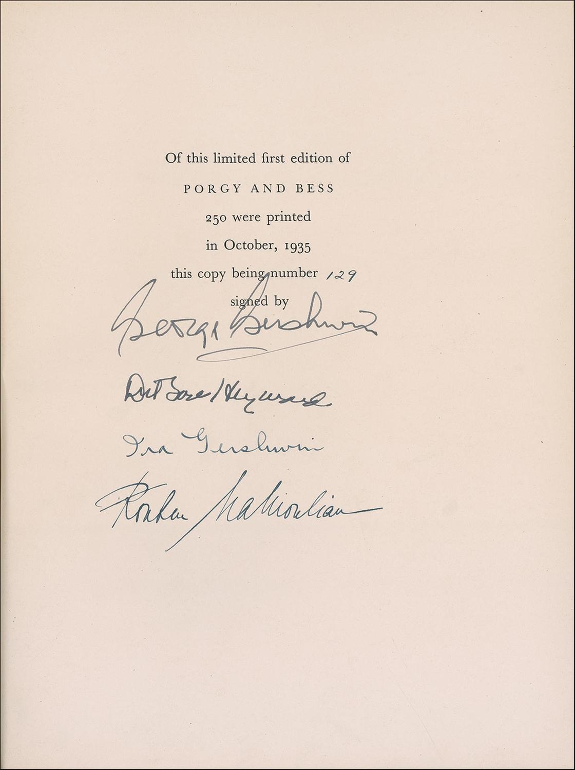 Signed book: Porgy and Bess, An Opera in Three Acts. Limited signed first edition of 250 copies (this being no. 129). NY: Random House, 1935. Hardcover with slipcase, 9.75 x 13, 559 pages. Signed on the limitations page by George Gershwin, Ira Gershwin, librettists Dubose Heyward, and director Rouben Mamoulian. In fine condition, with scattered light wear and dings to covers, moderate soiling to spine, a bit of light spotting to back pastedown, and missing the leather label on the front panel. Slipcase also rates fine with some scattered light surface wear. Overall, in much better condition then most of these copies that have survived. A scarce and very desirable pairing!