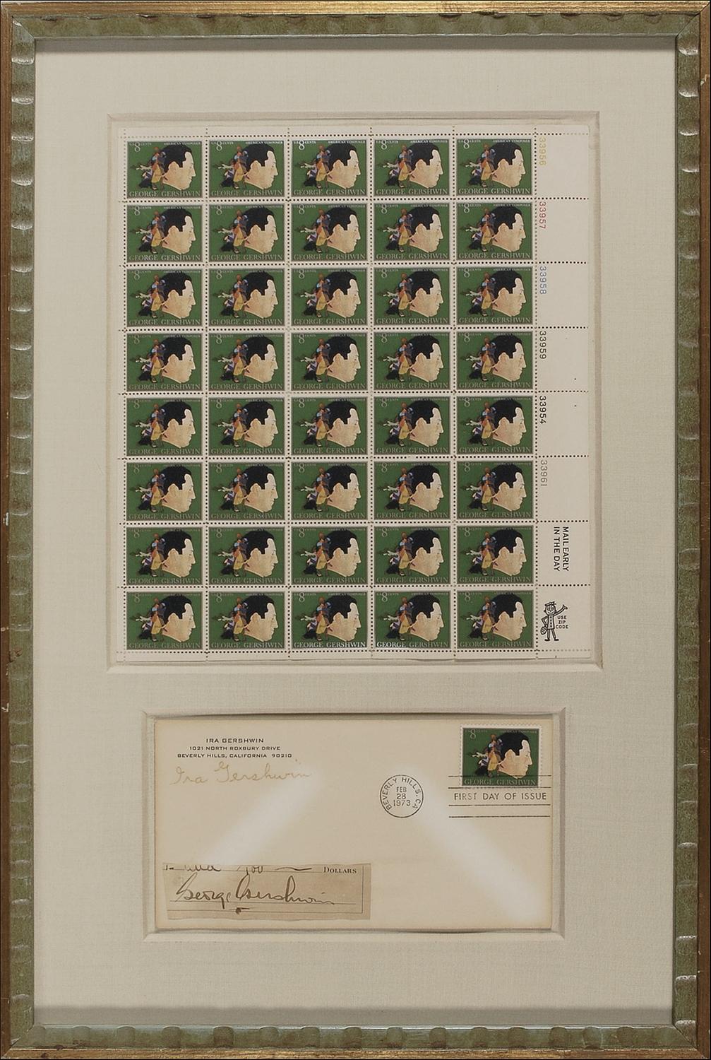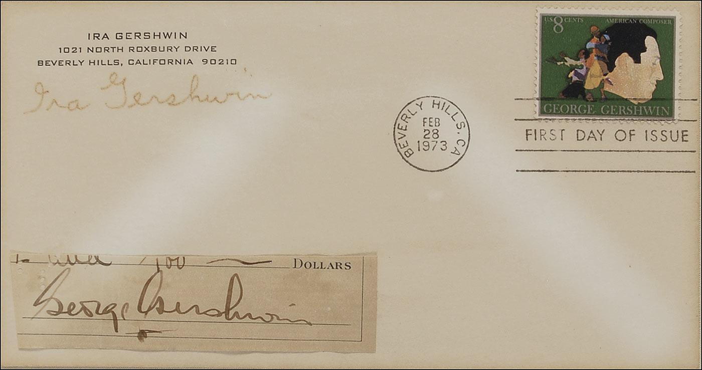 FDC, 7.5 x 4, honoring George Gershwin, signed in fountain pen by his brother, “Ira Gershwin,” at the upper left corner beneath his printed return address. Affixed is a fountain pen signature, “George Gershwin,” on a 4 x 1 slip clipped from a check. Matted with a sheet of 8-cent George Gershwin US postage stamps and framed to an overall size of 13.5 x 20. In very good condition, with moderate toning to the envelope, somewhat heavier through George’s signature.