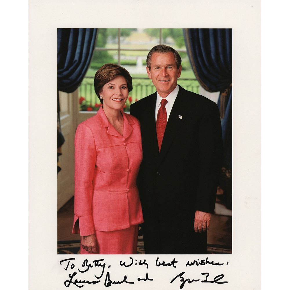 Color 8 x 10 cardstock photo of the first couple in the White House, signed and inscribed in the lower border in black felt tip, "To Betty, With best wishes, Laura Bush and" and "George W. Bush.” In fine condition, with a few small light bends.