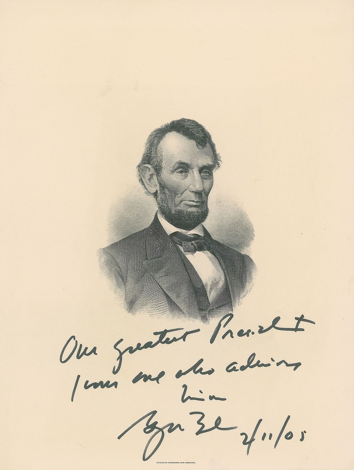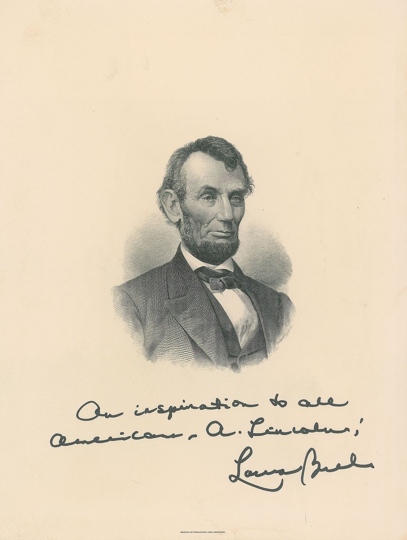 Attractive pair of engravings of President Abraham Lincoln by the Bureau of Engraving & Printing, 9 x 12, individually signed in black felt tip by the president and first lady, "Our greatest President, from one who admires him, George W. Bush, 2/11/05" and "An inspiration to all Americans—A. Lincoln, Laura Bush." In overall very fine condition. An uncommon and highly displayable format from the Bushes, both expressing their admiration for the 16th American president.