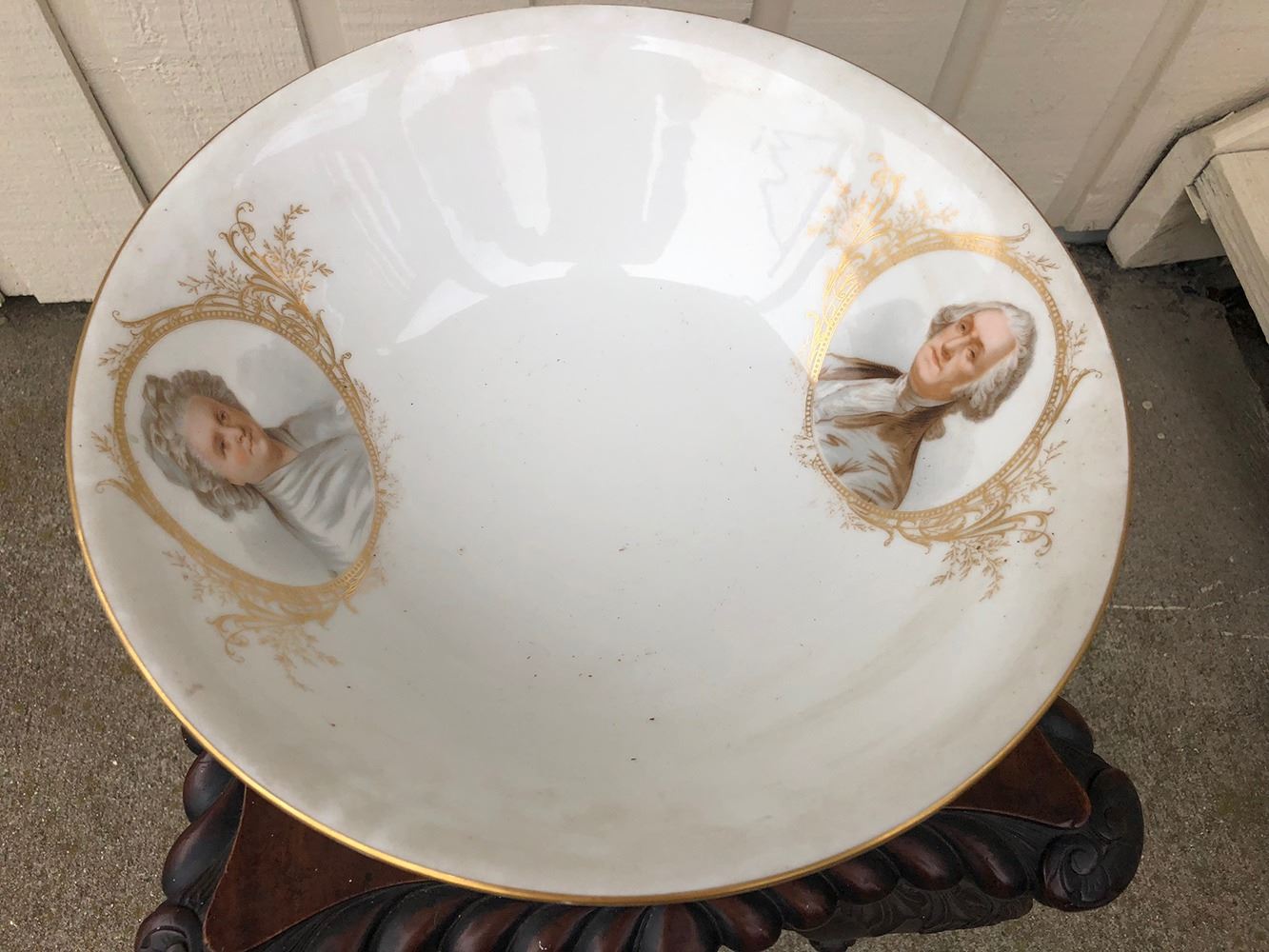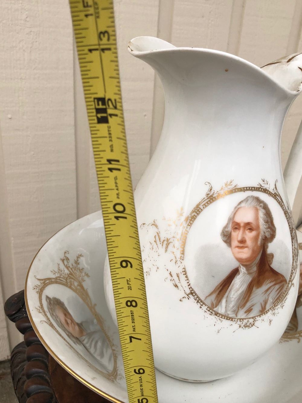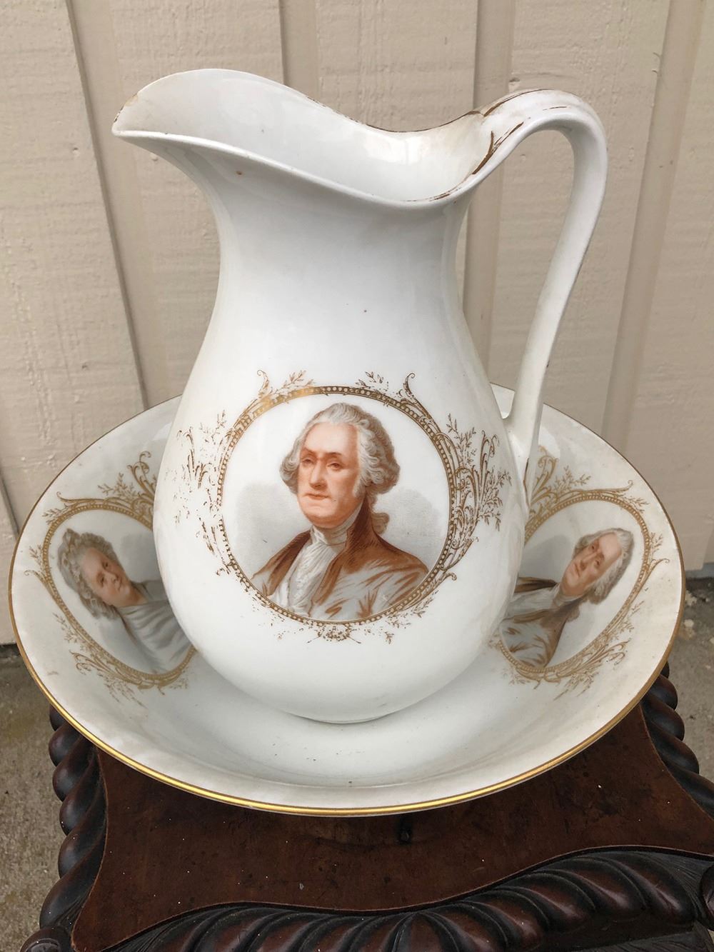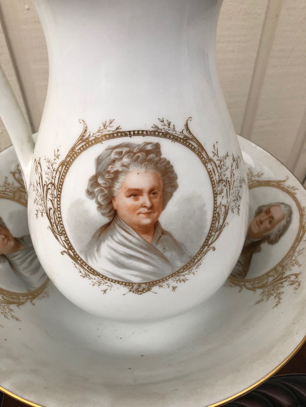 Beautiful George and Martha Washington pitcher and bowl, portraits with gold gilt. Very unusual, rare find! has to be a presidential piece, centennial or anniversary piece.Measures approx. 13†tall, portrait of George Washington on one side and Martha Washington on other side of pitcher, with gold gilt around portraits.Bowl has both portraits and gold gilt.Political collectors take notice, we’ve never seen one before!