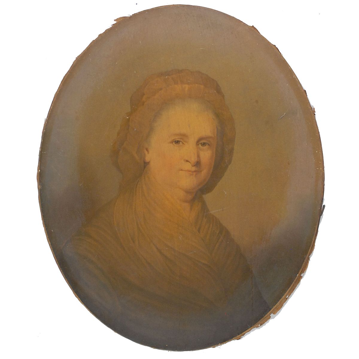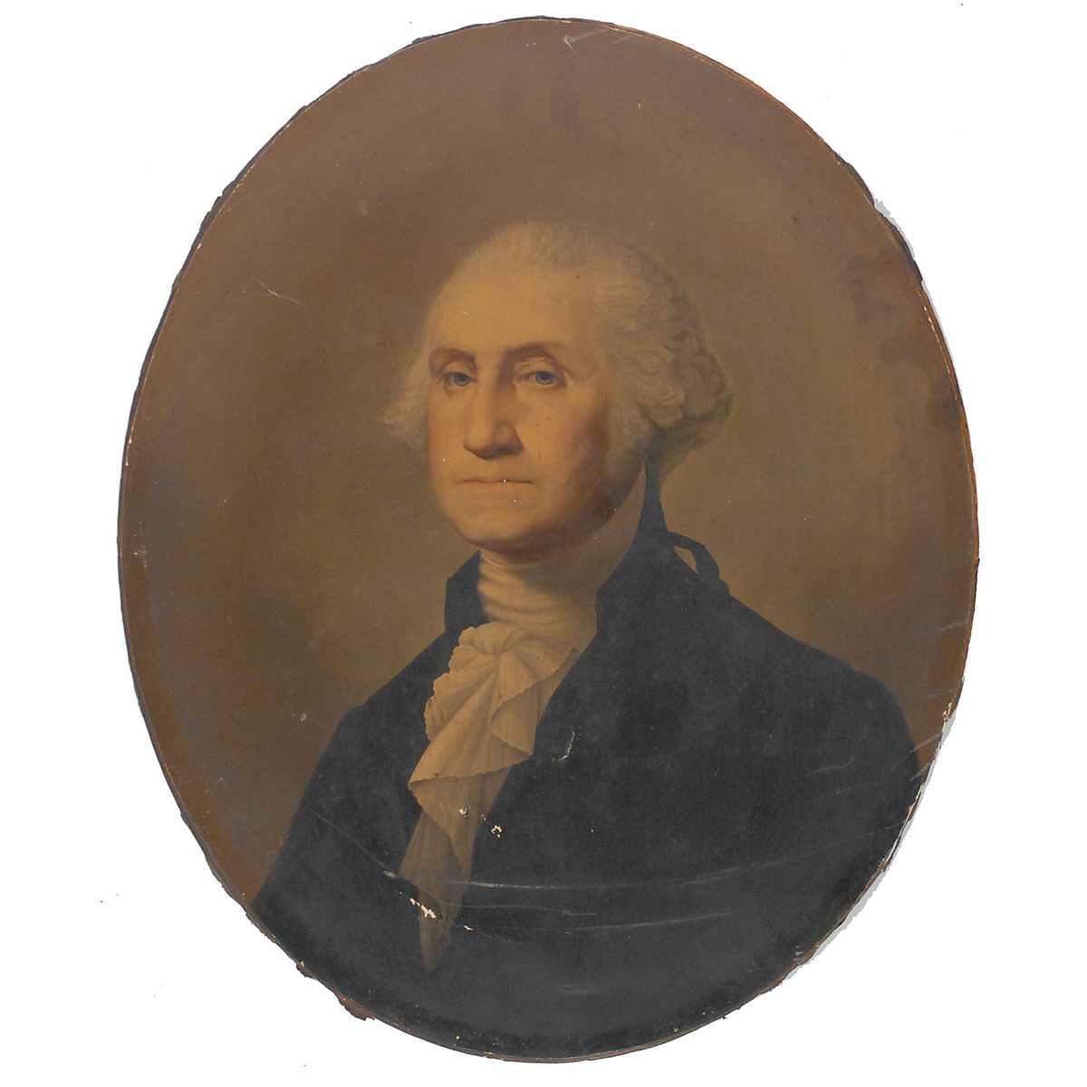 Two original color oval chromolithographic portraits of Gilbert Stuart’s portraits of George and Martha Washington by E. C. Middleton and Company of Cincinnati, Ohio. Each portrait measures approximately 14 x 17, and is affixed to its original wooden oval backing, with registration information printed on the reverse of both images. In very good condition, with George’s portrait partially separated from wood backing, scattered dings, small areas of surface loss and a small separation to George’s portrait, light discoloration to edges of both from previous display, and chips to the edges of canvas, which has separated from a few of the tacks.