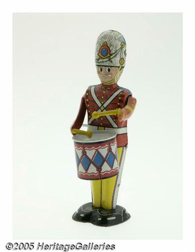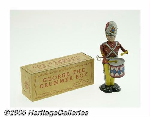 <B>George the Drummer Boy in Box (Marx, circa 1930s).</B></I> Wind up tin litho in original box. Manufactured in the 1930s by Louis Marx and Company. Toy is working, and stands about 9 inches tall. Complete and totally original in perfect working condition. Some very light surface scratches, and one very light mark on the drum head where the drum stick hits the top of the drum, otherwise in Excellent condition. A really great little toy for your collection. <I>From the Larry Jacobs Collection.</B></I>