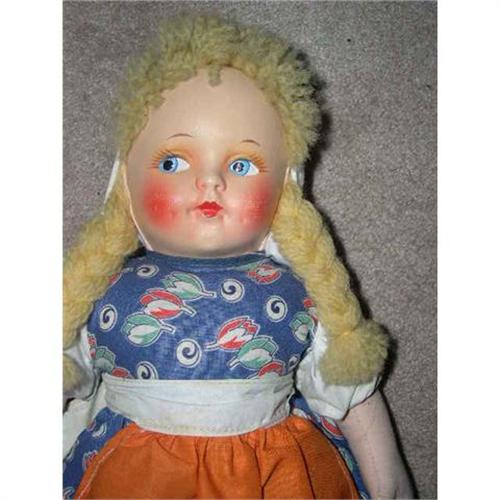 <table width="100%" border="0" cellspacing="0" cellpadding="4"><tr><td><em> Junel Novelties,Inc. Dutch Girl</em></td></tr><tr> <td width="100%"> This is a 15" mask face with painted features doll representing Holland. She is in her original outfit that is so typical of the time period. The blue cotton print is just so great! The only place where there is soil is the white material. It's not as white as it might have originally been. On the back of the hat, where the head seam is and the doll has laid on her back, the white has a dark line. She has on nonstretched rayon socks and her original shoes. These looks mint. You can tell they have never been untied. She has yellow yarn hair. She has mitten type hands. The tag is pinned to the back of her aporn. It says I am Gretchen of Holland. On the back it says Product of Junel Novelties, Inc. She is from a smoke free environment. If you can love her,please bid! Buyer to pay $15 for U.S. shipping, insurance, and handling. Thanks for viewing. </td></tr><tr> <td> </td></tr><tr> <td>Reference #: CL138</td></tr><tr><td>Condition:Excellent</td></tr><tr><td>Year:Circa 1940's</td></tr><tr><td>Country:U.S.A.</td></tr><tr><td>Maker:Junel Novelties, Inc.</td></tr><tr><td>Height:15</td></tr><tr><td>Title:Georgene- Molleye type mask face doll 15"</td></tr><tr><td>Style:Dutch Girl </td></tr><tr><td>Materials:cloth</td></tr><tr><td>Type:International doll - Holland</td></tr><tr><td>Location:Neapolis, OH</td></tr></table>