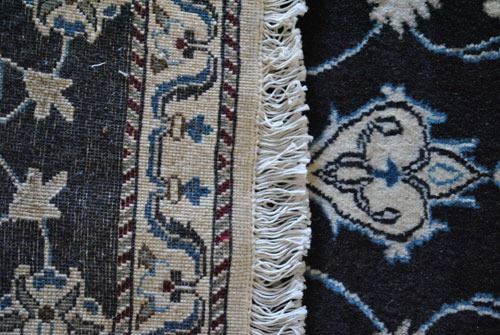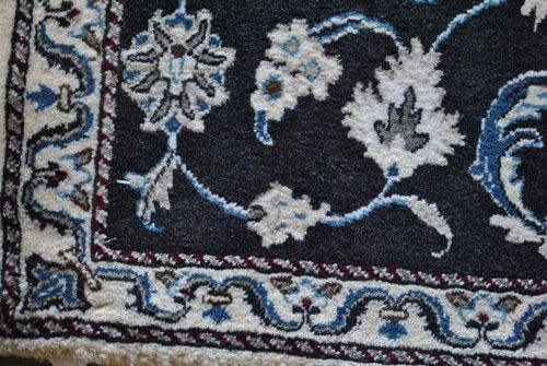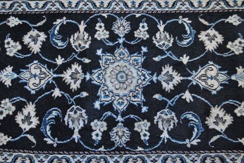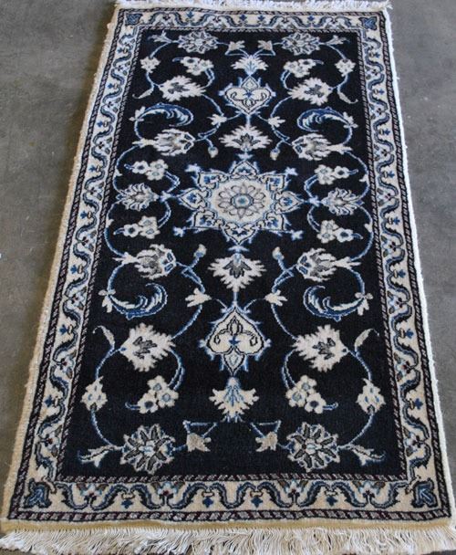Fine quality silk blended Persian Nain rug, size 4.6 X 2.6 feet, made of 100% baby lamb's wool part silk on cotton foundation. Hand made vegetable dye rug from city of Nain. Country of origin: Iran.