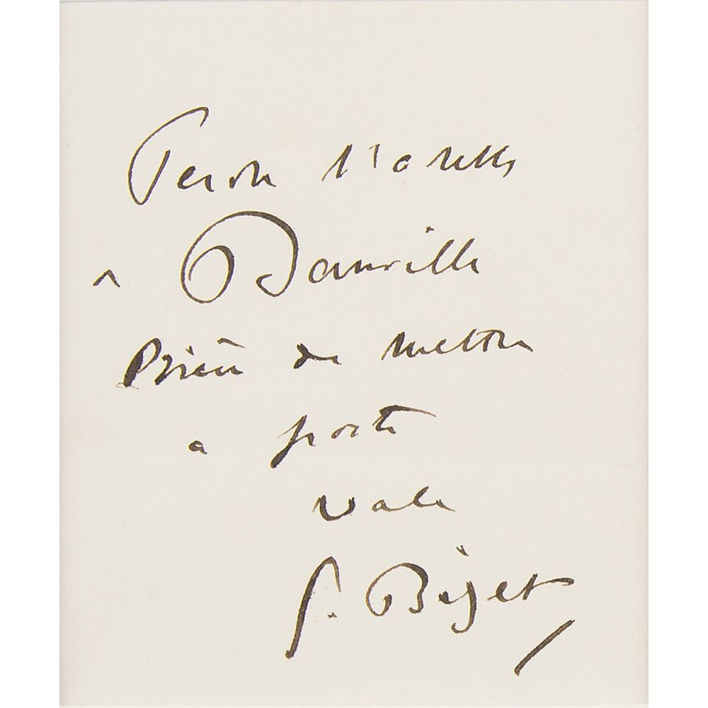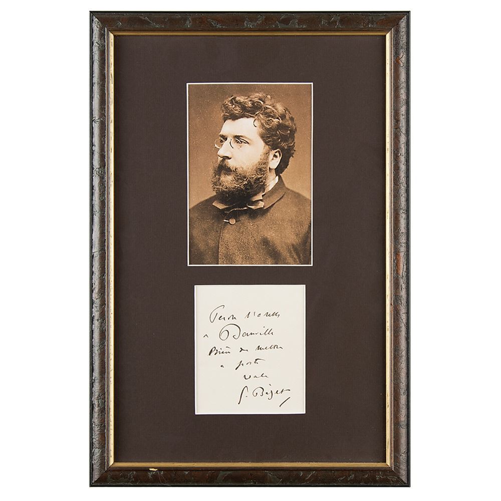 French composer (1838–1875) whose operatic masterpiece, Carmen, was completed just before his untimely death from heart disease. Bold untranslated ink signature and inscription in French, signed "G. Bizet,” on an off-white 3.5 x 4 slip. Nicely archivally matted and framed with a portrait to an overall size of 10.25 x1 5.25. In fine condition.