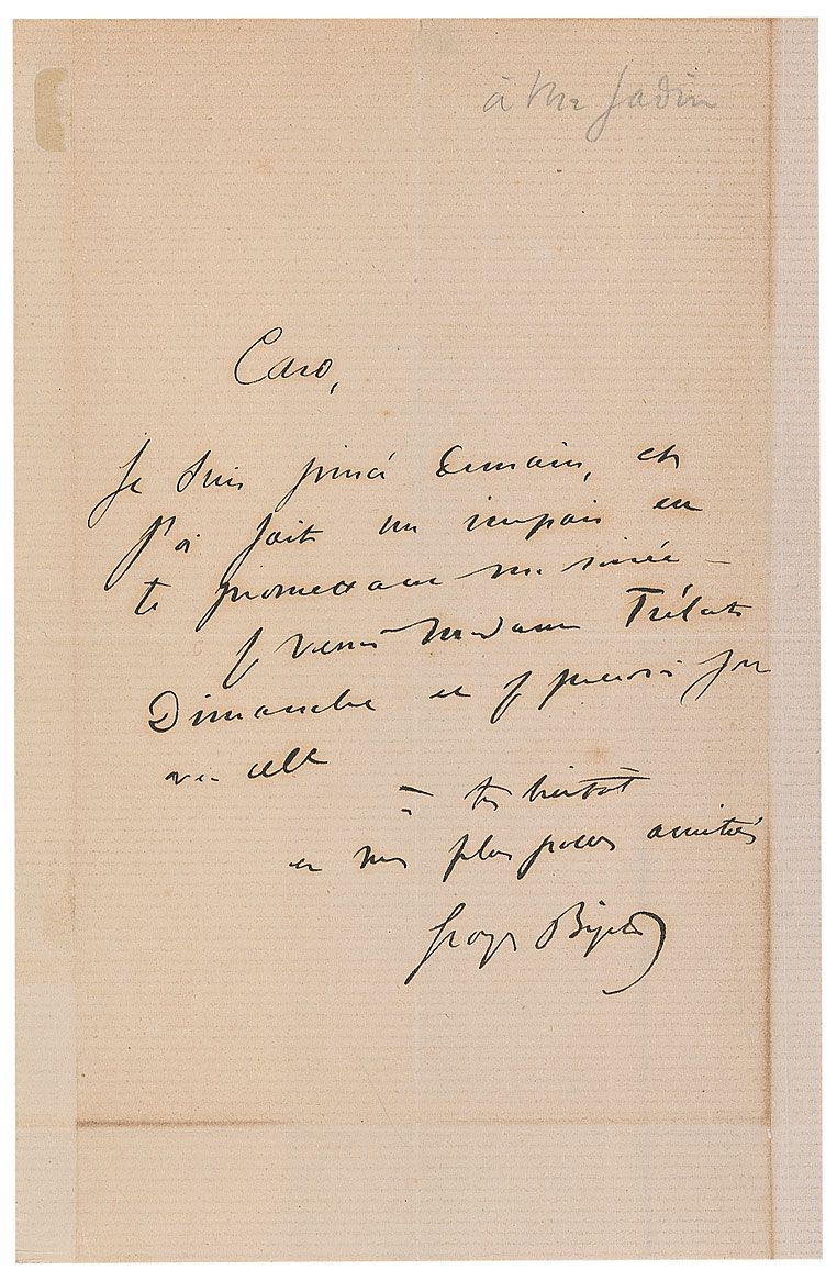 French composer (1838–1875) whose operatic masterpiece, Carmen, was completed just before his untimely death from heart disease. Scarce ALS in French, one page, 5.25 x 8, no date. Letter to Caro. In full (translated): “I’ve been grabbed by someone else for tomorrow and I was quite imprudent to promise you my evening. I will see Madame Trélant on Sunday and I will then talk to her. Hope to see you soon, with all my friendship.” In very good condition, with intersecting folds, a uniform block of toning over text and signature, pencil notation to top edge, small tear to top edge, and small adhesive remnants to left side. With only a handful of letters from Bizet, this note represents one of the limited known communications that remain from the esteemed composer.