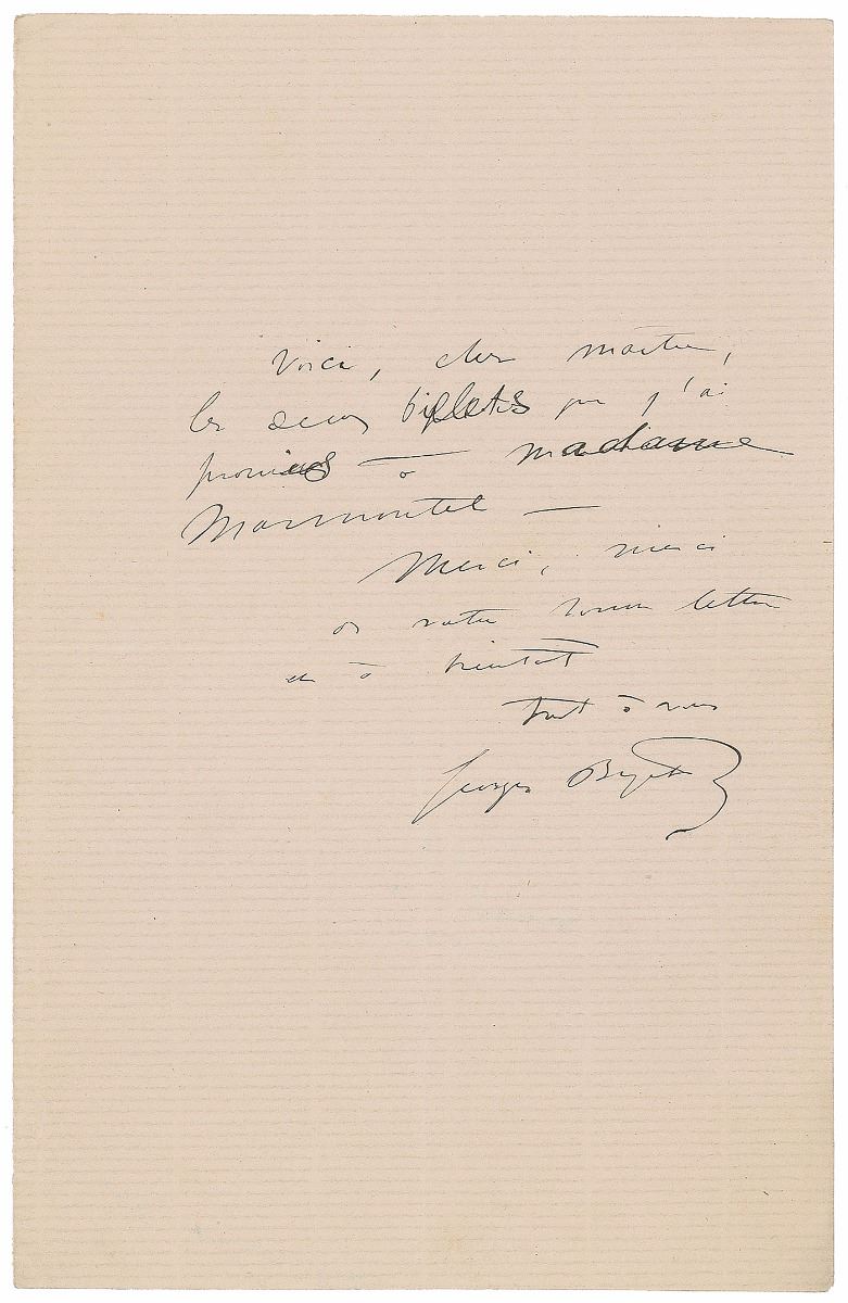 French composer (1838–1875) whose operatic masterpiece, Carmen, was completed just before his untimely death from heart disease. ANS in French, one page, 5.25 x 8.25, no date. In full (translated): "Here, dear master, the two tickets I promised Madame Marmontel.” In fine condition, with central vertical and horizontal folds.