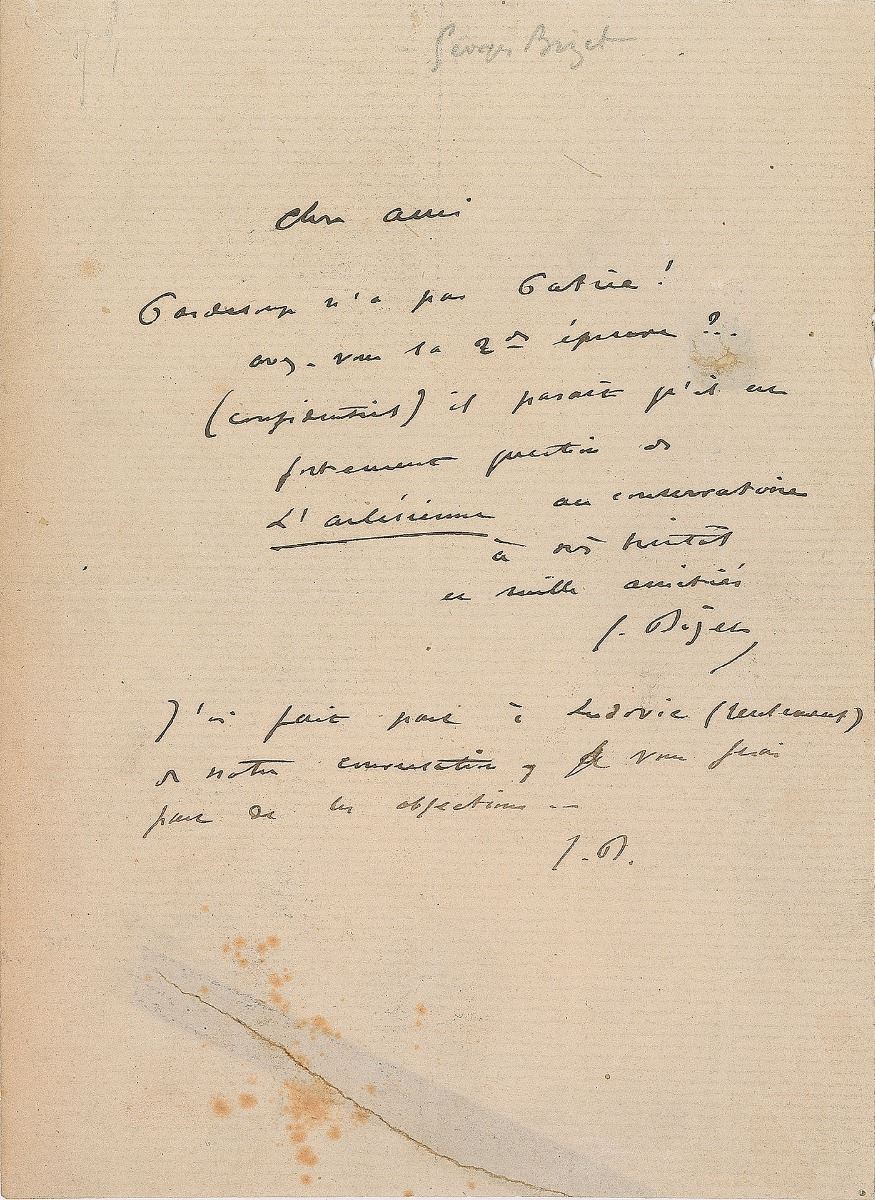 French composer (1838–1875) whose operatic masterpiece, Carmen, was completed just before his untimely death from heart disease. ALS in French, signed “G. Bizet,” one page, 5.25 x 7.5, no date. Letter to his editor Antoine de Choudens, in full (translated): "Pasdeloup doesn’t have Patrie! Do you have the second proof? (Confidential) It seems that there is a very strong possibility of L’Arlesienne at the Conservatory.” He adds a postscript, signed “G. B.,” in full: “I’ve informed Ludovic (only) of our conversation. I’ll inform you about his objections.” In very good to fine condition, with some light foxing, and a small hole and tear at the bottom repaired with old tape on the reverse.