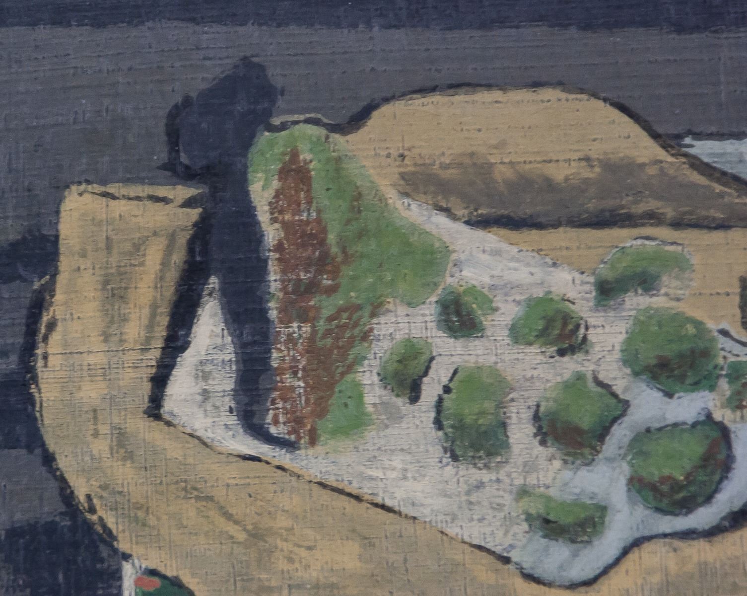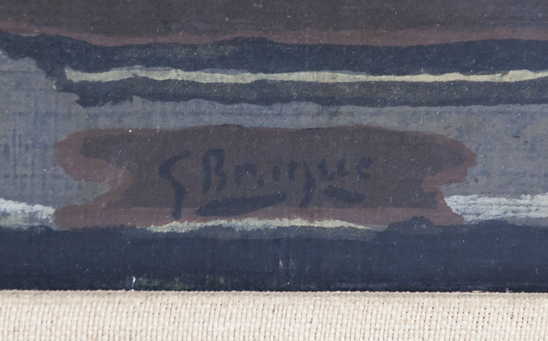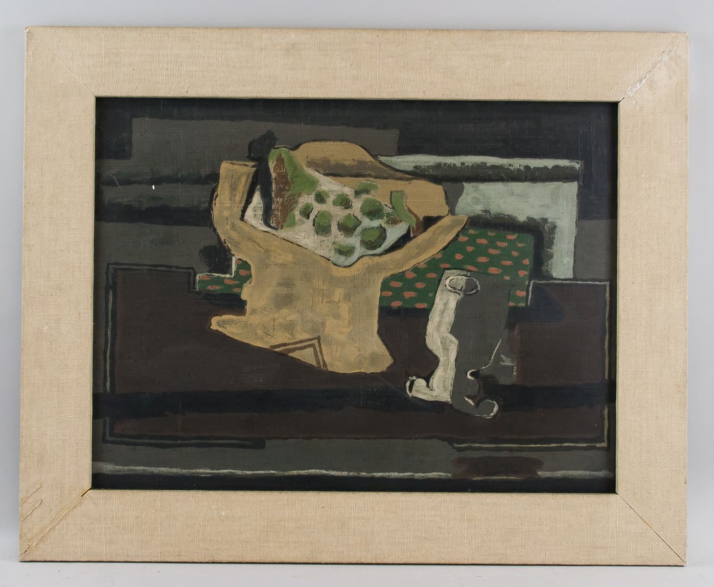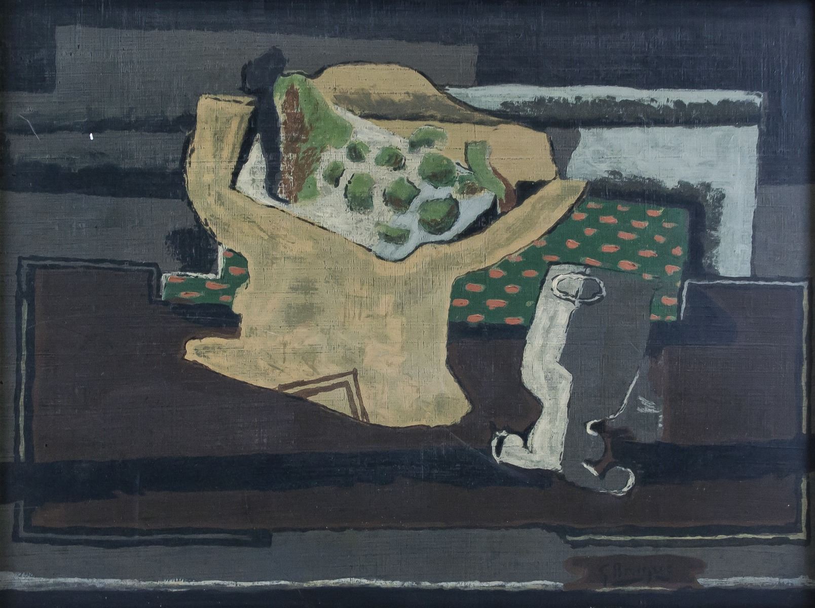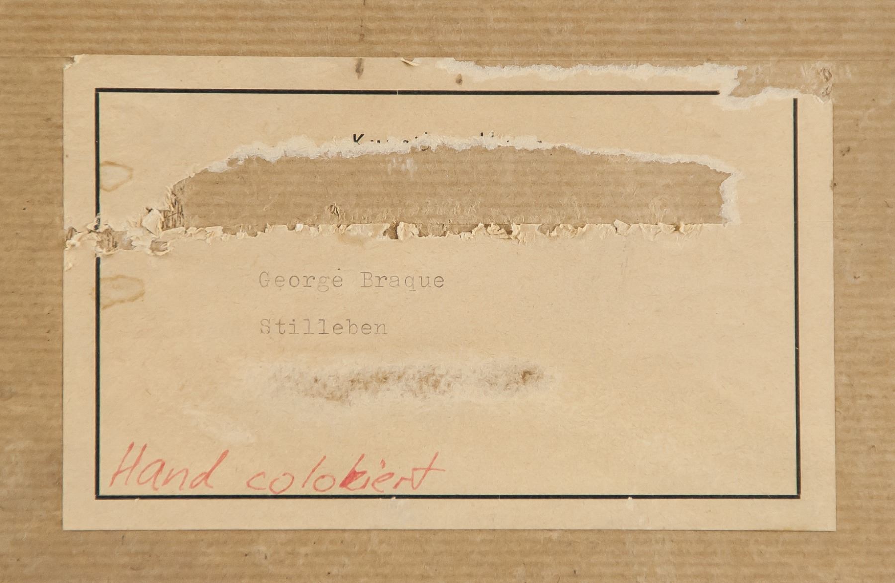 Oil on paper. Featuring a cubist still of objects. Signed G. Braque on the lower right corner. Label affixed to verso inscribed George Braque / Stilleben / Hand coloriert. Inscribed in pencil on verso 6166. 51 x 40 cm (20.1 x 15.8 inches). Framed size: 54 x 68 cm (21.3 x 26.8 inches). PROVENANCE: Private Canadian collection