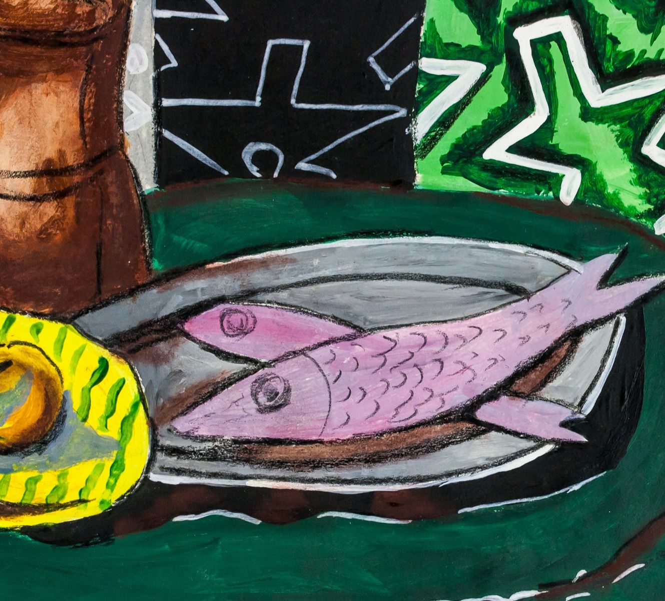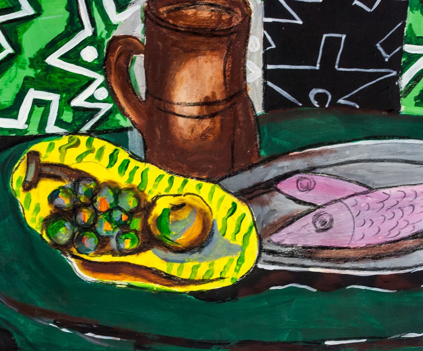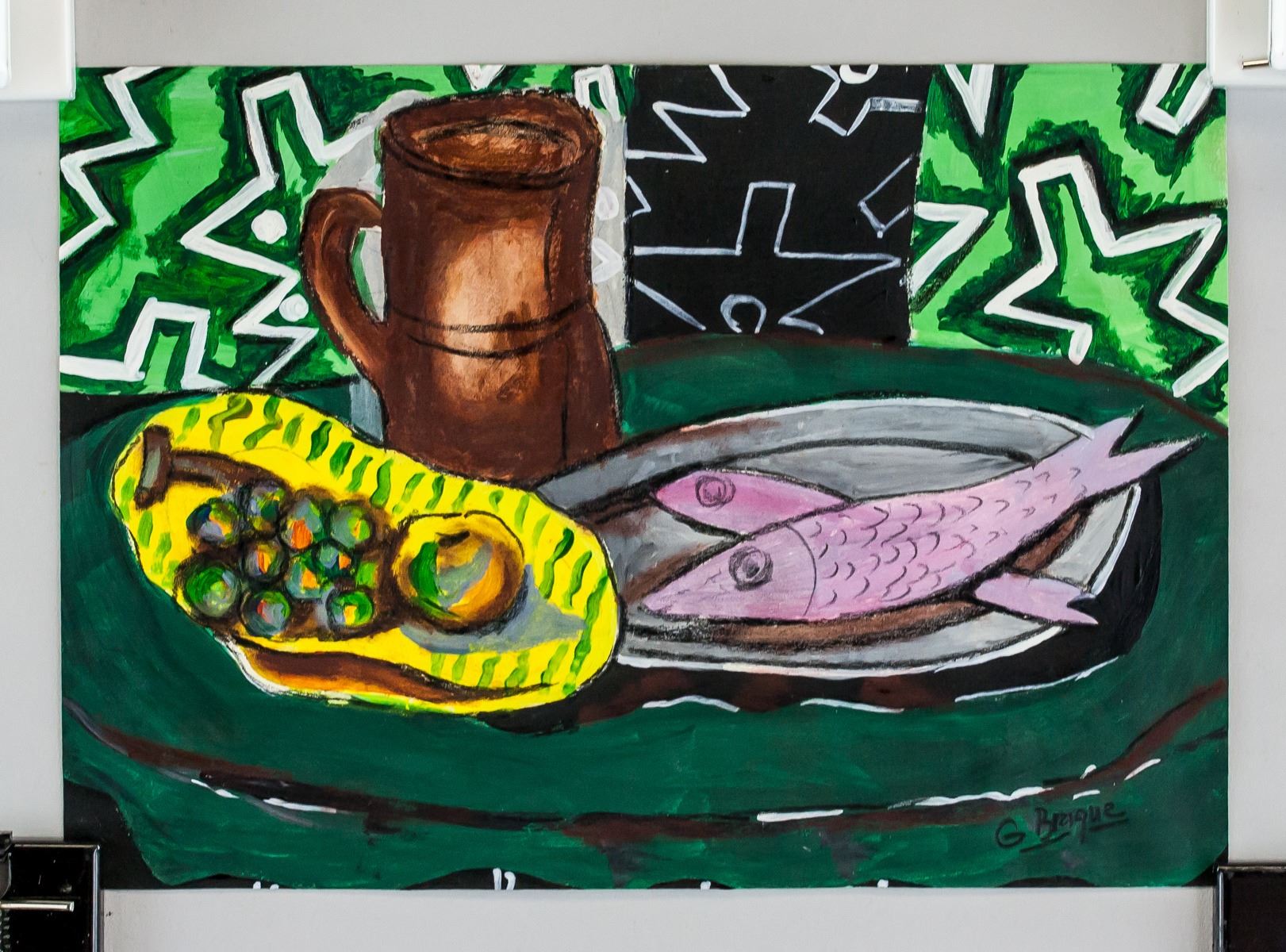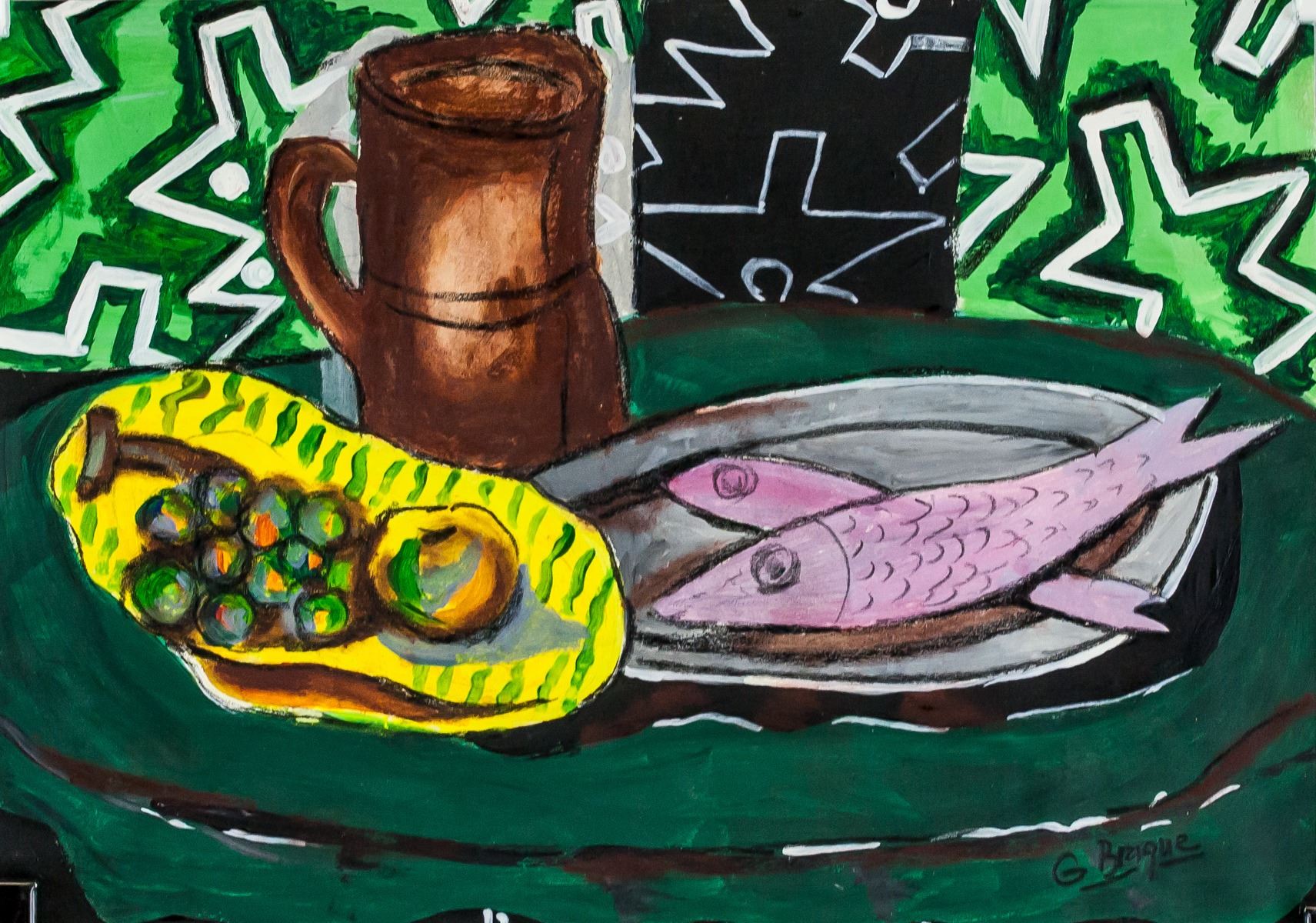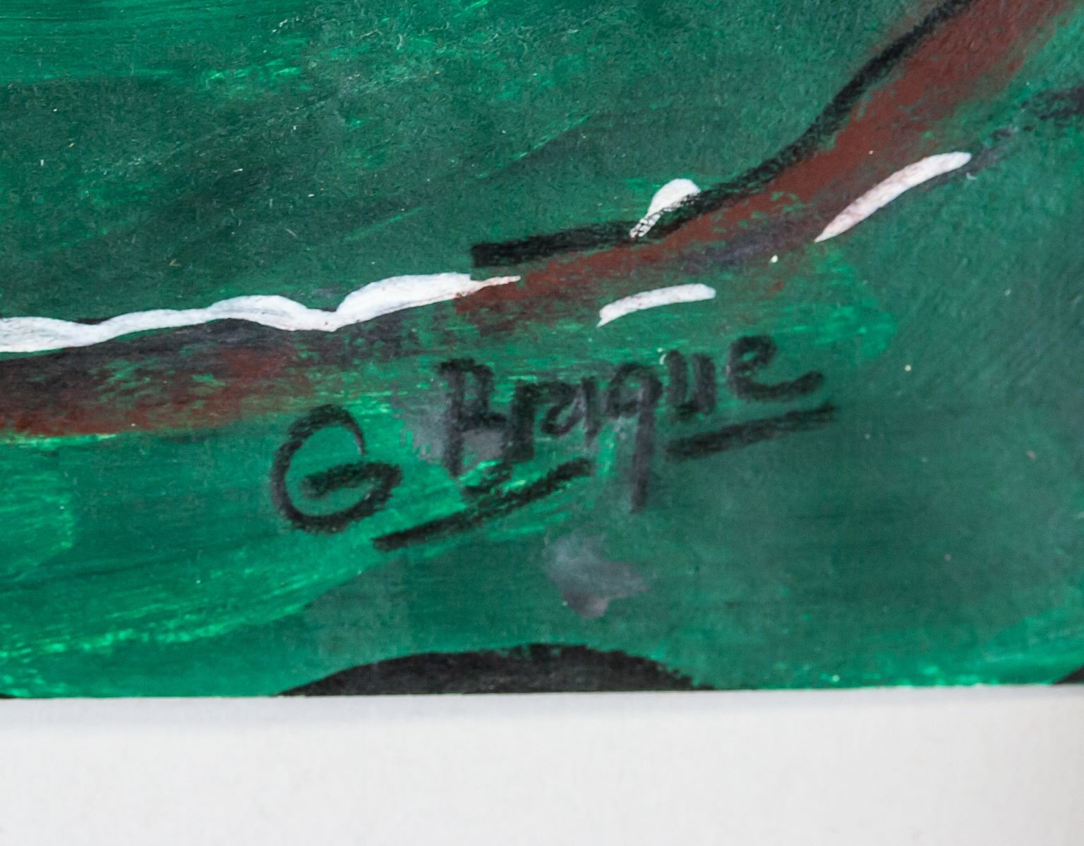 Tempera on paper. Featuring a cubist still life of plates with fruit and fishes with jug/ Signed G. Braque on the lower right corner. Inscribed 542 in pencil, verso. Stamped illegibly on verso. Attributed to Georges Braque (1882-1963, French). 13.5 x 19.5 cm (5.25 x 7.75 in). PROVENANCE: Southern Ontario estate