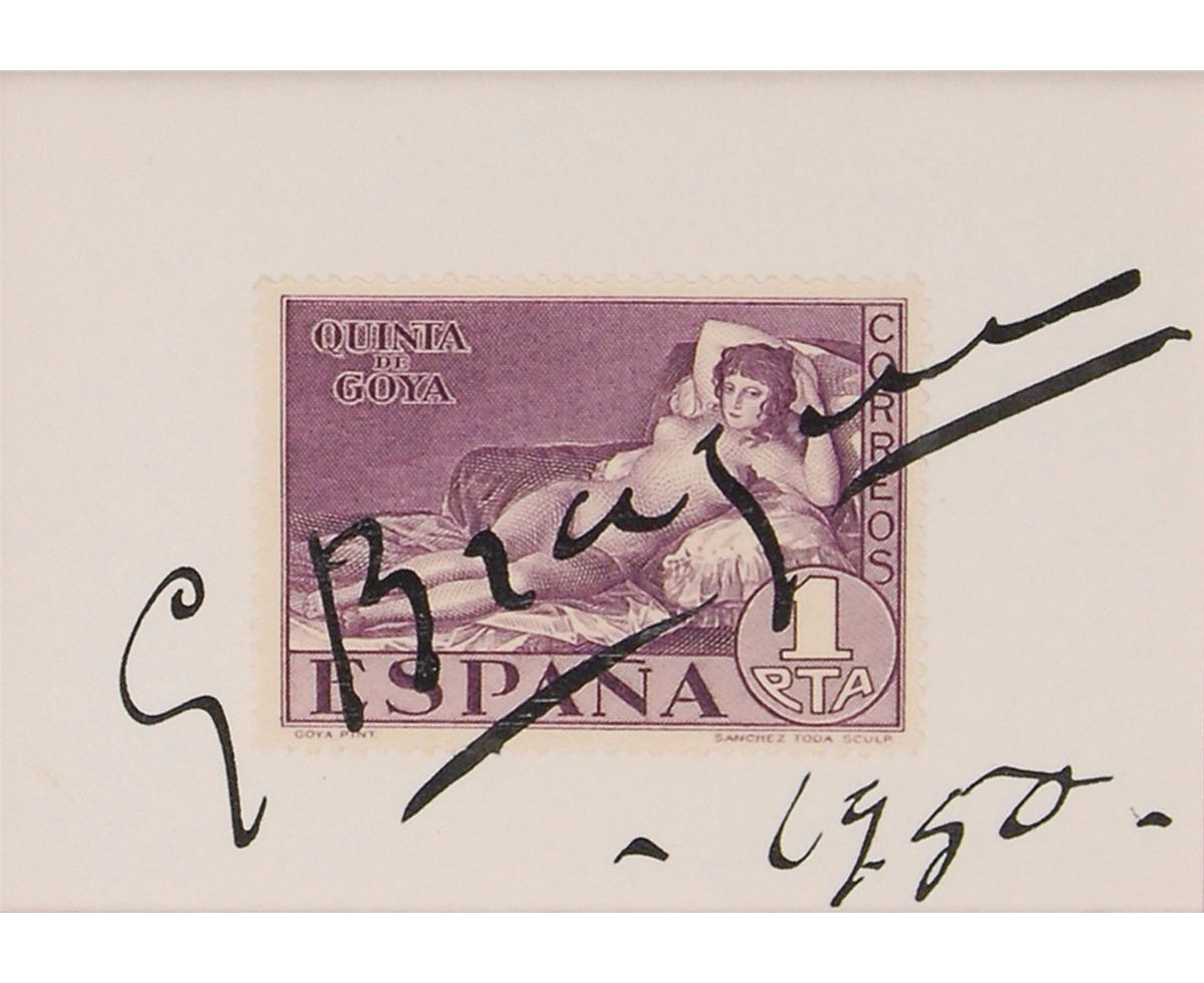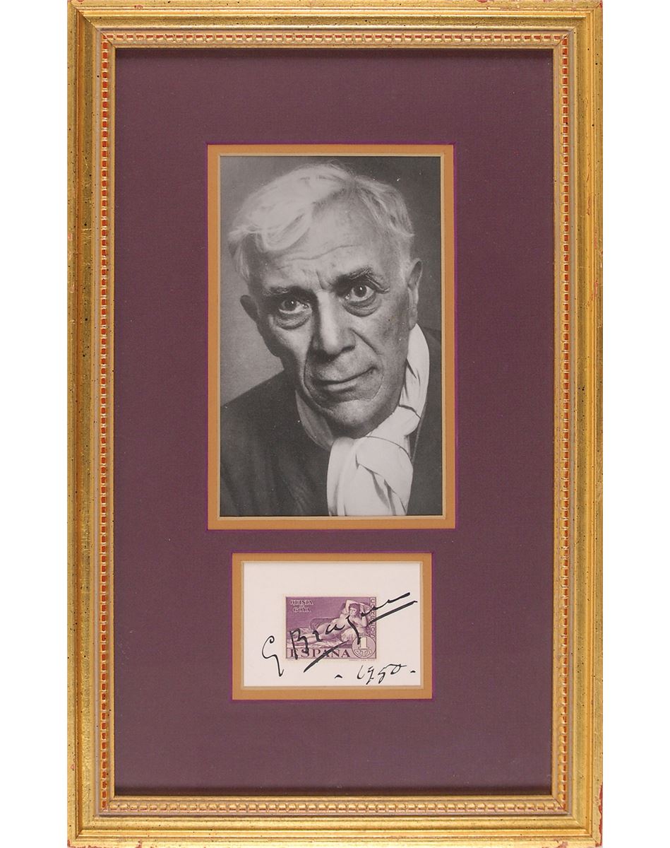 Important French painter (1882–1963) who, along with Picasso, was one of the seminal figures in the development of Cubism. Ink signature, “G Braque, 1950,” boldly penned across a Spanish postal stamp honoring the artwork of Goya. The stamp is affixed to a white 3.25 x 2.25 card. Double-matted and framed with a portrait of the artist to an overall size of 10 x 16. In fine condition.
