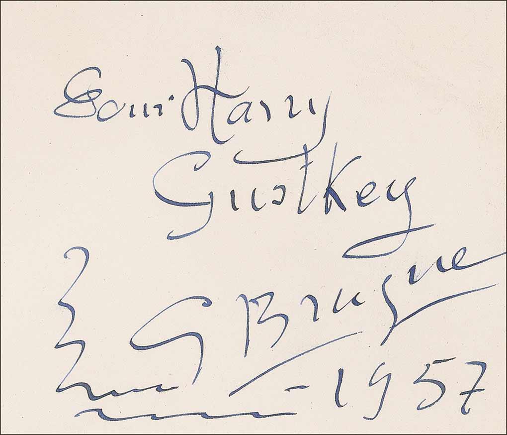 Important French painter (1882–1963) who, along with Picasso, was one of the seminal figures in the development of cubism. Fountain pen signature and inscription, “Harry Guatkey, G. Braque 1957,” on an off-white 4.25 x 3.5 card, with Braque adding a small flourish to lower left corner. In very fine condition.