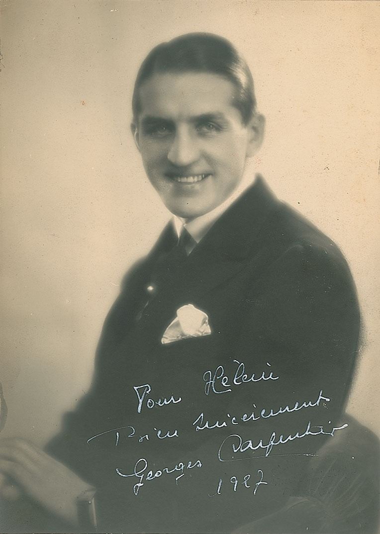 French boxer, actor and World War I pilot (1894–1975) who fought mainly as a light heavyweight and heavyweight in a career lasting from 1908 to 1926. Vintage matte-finish 5 x 6.75 soft-focus portrait of Georges Carpentier in a handsome half-length pose, signed and inscribed in French in white fountain pen. Lower right corner features a blindstamp for the G. L. Manuel Studio of Paris. In fine condition.