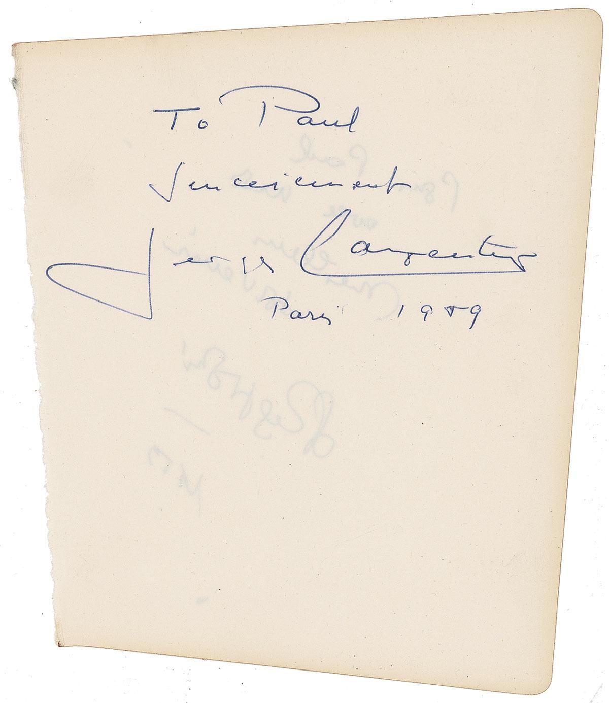 French boxer; the only fighter ever to fight championship matches in every weight class. Ballpoint signature, “To Paul, Sincerement, Georges Carpentier, Paris 1959,” on an off-white approximately 5 x 6 irregularly designed album page. In fine condition, with show-through from another signature on the reverse.