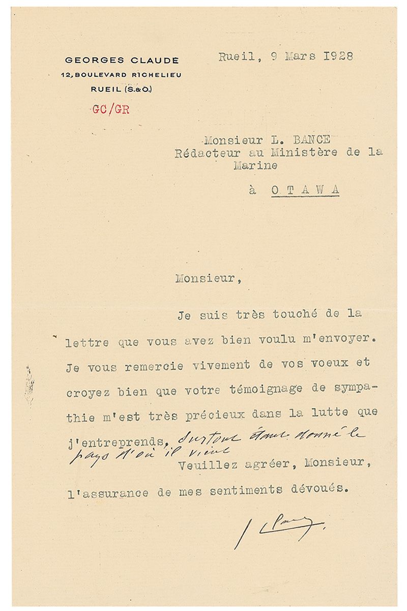 Engineer and inventor (1870–1960) best known for the invention of neon lighting. TLS in French, signed “G. Claude,” one page, 5 x 8, personal letterhead, March 9, 1928. Untranslated letter to Lucien Bance, with Claude adding one sentence in his own hand. In fine condition, with some light soiling to left edge.