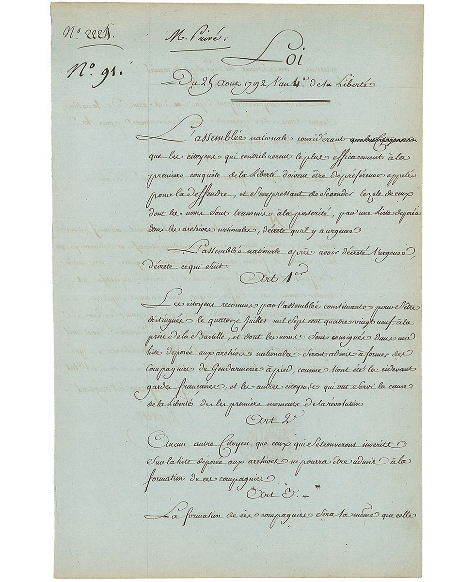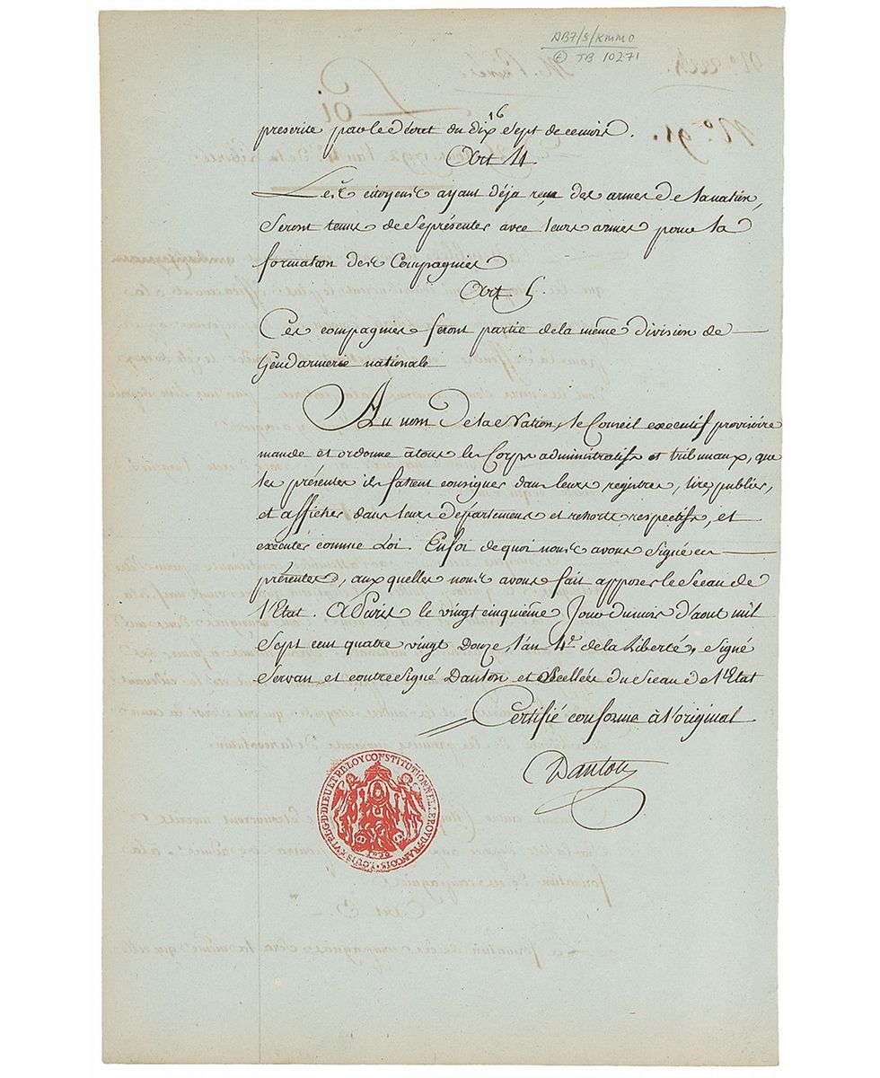 French statesman (1759–1794) and one of the leading figures of the French Revolution. He and his followers were charged with conspiracy to overthrow the government and who was guillotined in 1794. Rare manuscript DS in French, signed “Danton,” one page both sides, 9.5 x 14.5, August 25, 1792. Certified copy of a decree by the National Assembly regarding the creation of a citizen’s infantry guard. In part (translated): “The citizens who contributed most efficiently to the first conquest of Liberty must be the first to defend it...Citizens who distinguished themselves, as recognized by the Constituent Assembly, on July 14th 1789, during the taking of the Bastille...will be admitted to form companies of foot guard, as have been the aforementioned National Guard and other citizens who served the cause of Liberty from the first moments of the revolution...Citizens having already received arms from the nation must bring those arms when they come to form those companies. These companies will be part of the same division of the National Guard.” In fine condition, with mild edge toning. As a member of the Commune of Paris, Danton helped set the stage for the attack on the Tuileries and the overthrow of the monarchy, which took place just weeks before this decree, on August 10, 1792. In the new republic, he became minister of justice and virtual head of the Provisional Executive Council. A fantastic document of great historical importance in the context of the French Revolution.