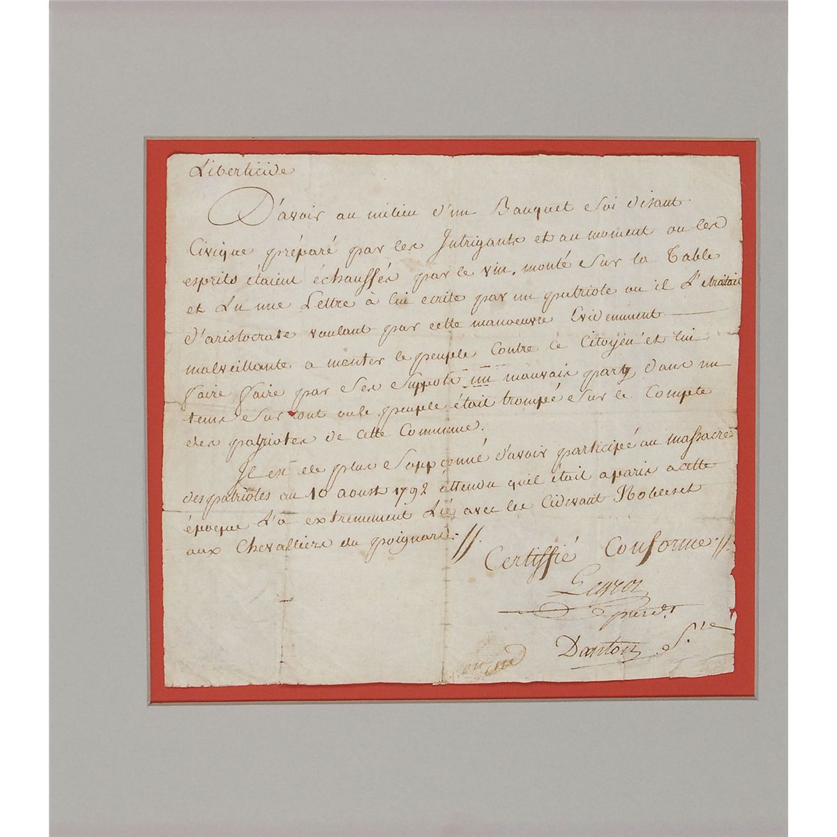 Manuscript DS in French, signed “Danton,” one page, 7.75 x 7.25, circa 1793. Document outlining charges brought against an enemy of the state. Mounted in a mat to an overall size of 10 x 11.5. In very good condition, with intersecting folds, light scattered soiling, and a tear passing between the last two letters of his signature.