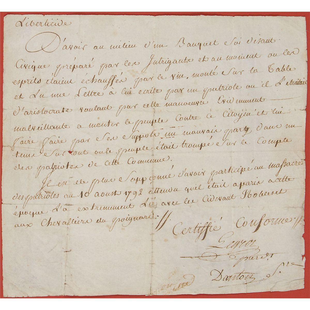 Manuscript DS in French, signed “Danton,” one page, 7.75 x 7.25, circa 1793. Document outlining charges brought against an enemy of the state. Mounted in a mat to an overall size of 10 x 11.5. In very good condition, with intersecting folds, light scattered soiling, and a tear passing between the last two letters of his signature.