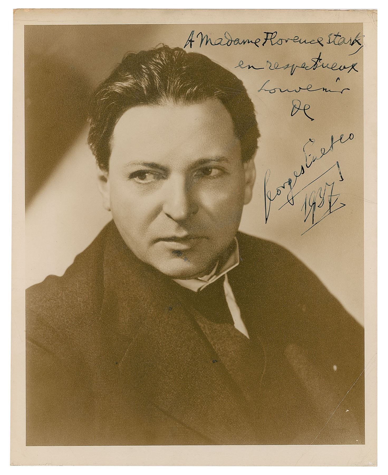 Vintage pearl-finish 8 x 10 photo of the noted Romanian composer, signed and inscribed in fountain pen, "A Madame Florence Stark, en respectueux, souvenir de Georges Enesco, 1957.” In very good condition, with creasing, heaviest to the lower right corner, and a lighter crease and stain touching Enesco's lower lip. Accompanied by a full letter of authenticity from JSA.